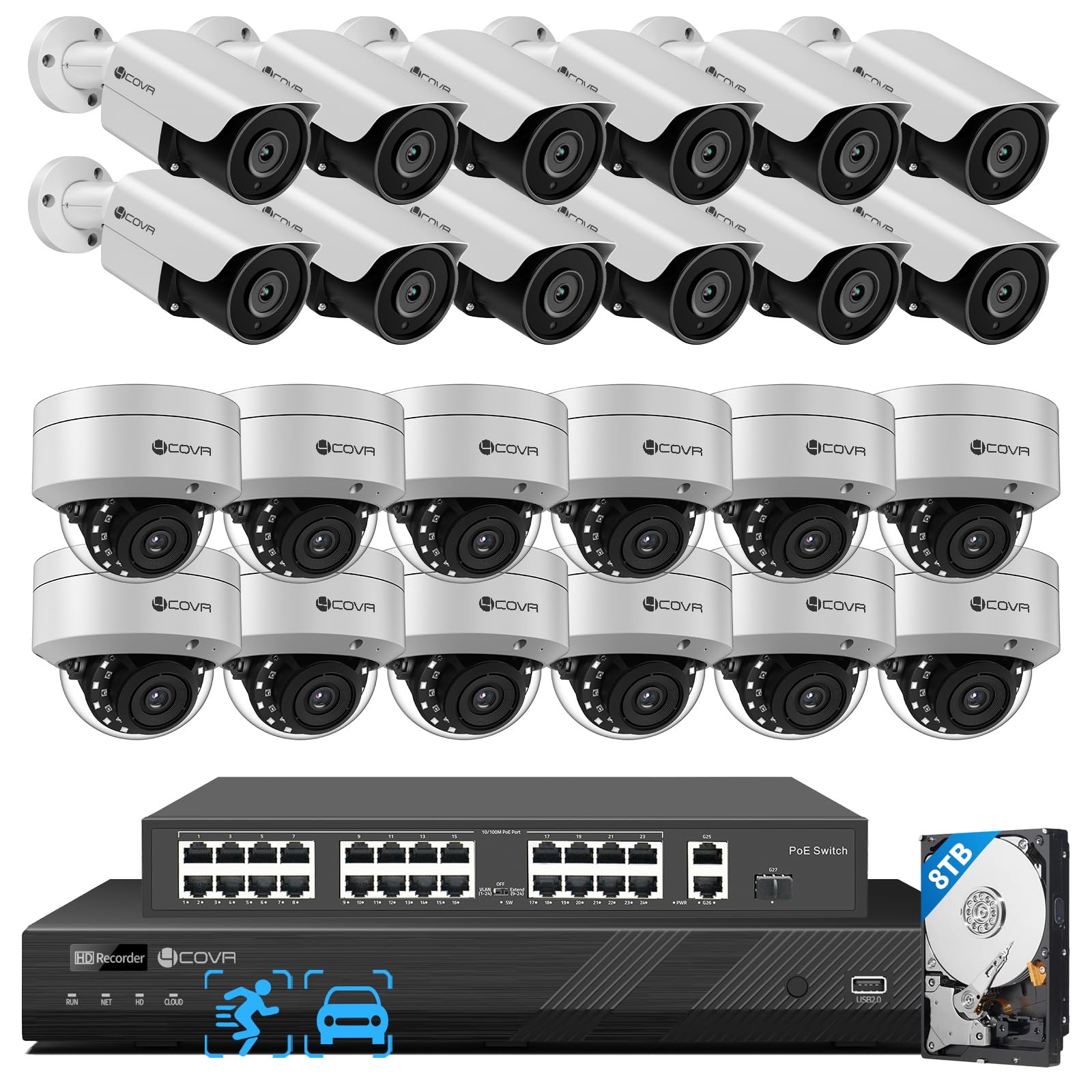 4COVR 4K PoE 32 Channel Security Camera System, 12 Dome IK10 Vandal-Proof 12 Bullet 8MP Commercial IP Camera IP67 Night Vision, AI Human/Vehicle