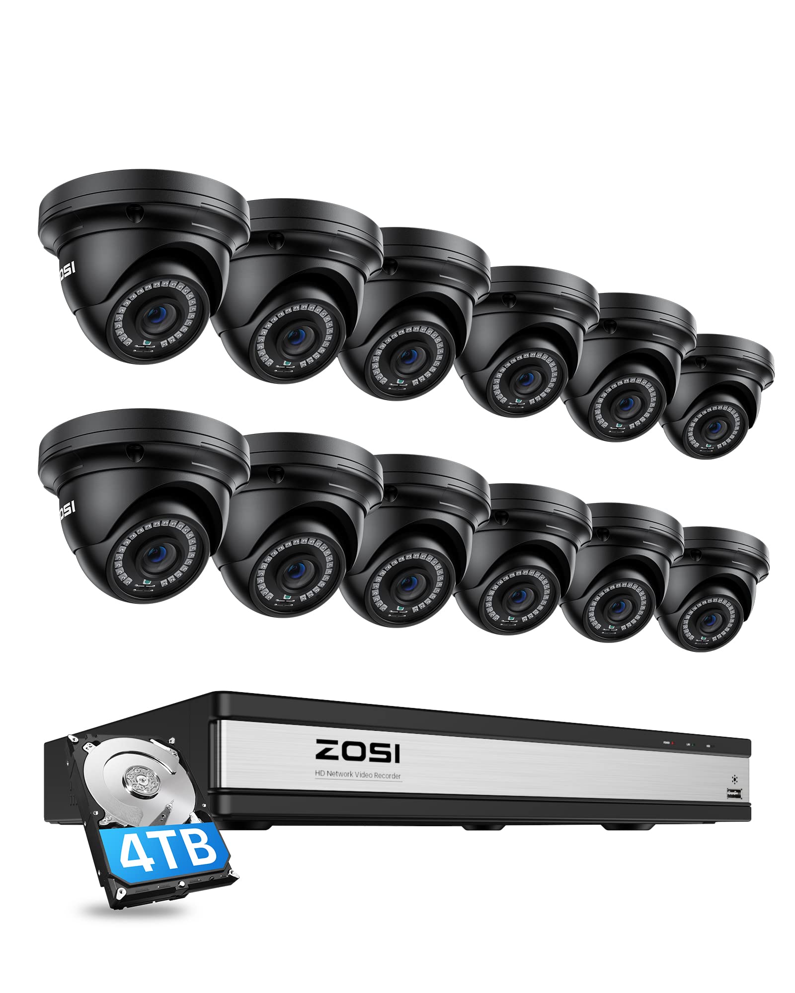 ZOSI H.265+ 4K 16CH PoE Security Camera System, 12 X Wired 5MP (3K) Dome PoE IP Cameras Outdoor Indoor, 16CH NVR with 4TB HDD for 24/7 Recording, 80ft