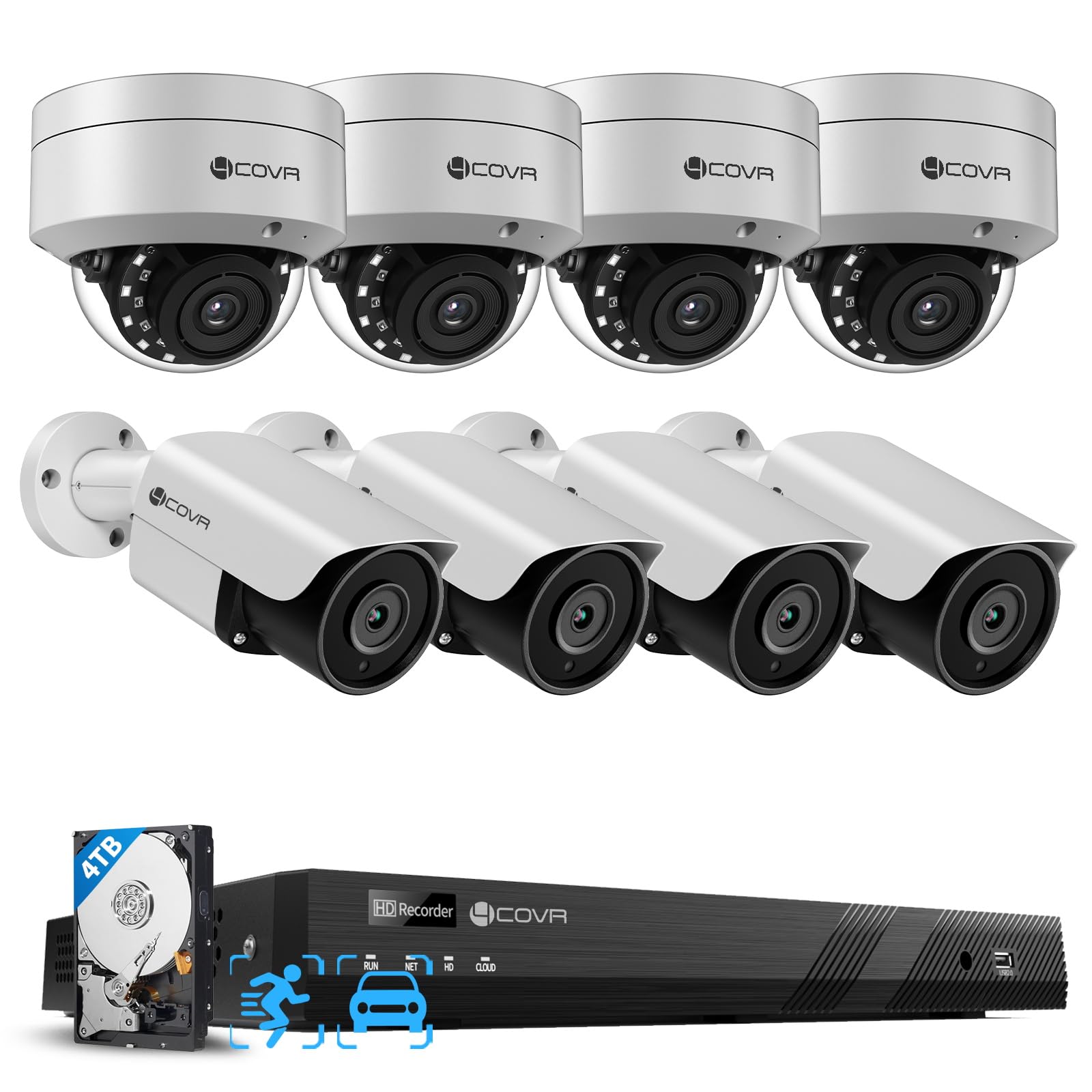 4COVR 16 Channel PoE Security Camera System for Business, Human Vehicle Detection, 4K NVR with 4TB HDD, 4 Dome IK10 Vandal-Proof 4 Bullet 5MP Wired IP