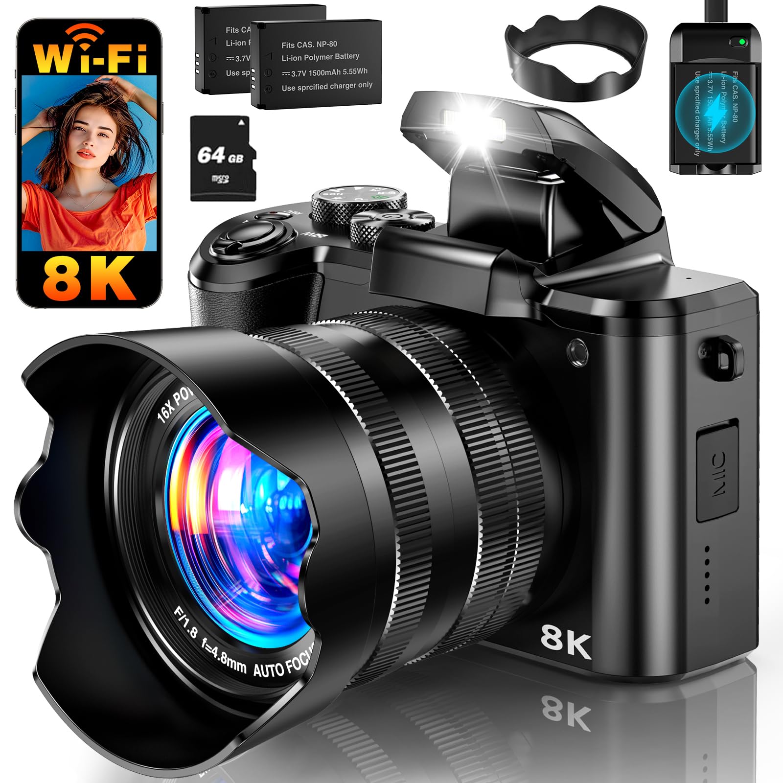 8K Digital Camera, 88MP WiFi Cameras for Photography with 3.2" Touchscreen, 16X Zoom Autofocus Professional Dual Camera, Anti-Shake, 2 Batteries &