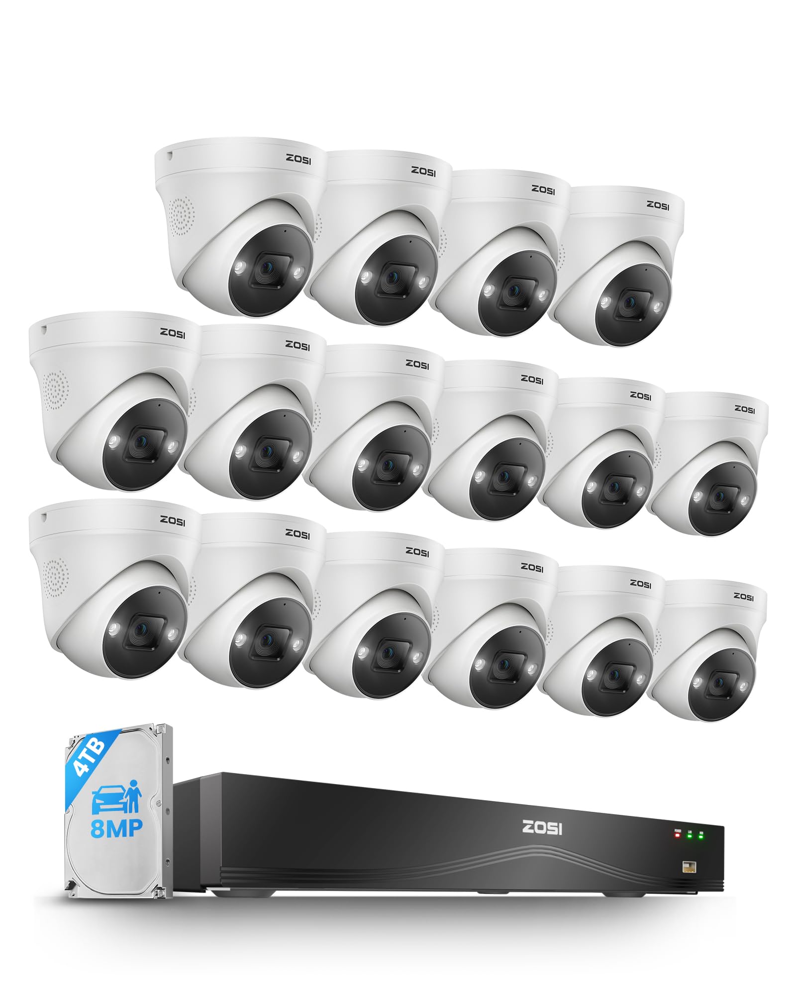 ZOSI 32CH 4K PoE Security Camera System,16pcs 8MP Dome Cameras,Person Vehicle Detection,Two-Way Talk,Spotlight Color Night Vision,16Port 32Channel NVR