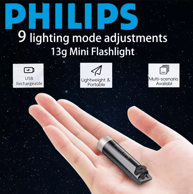 Stay prepared anywhere with the Philips rechargeable mini EDC flashlight, a compact yet powerful tool designed for everyday carry. Built with bright LED illumination, it provides reliable light for camping, hiking, late night walks, or emergencies....
