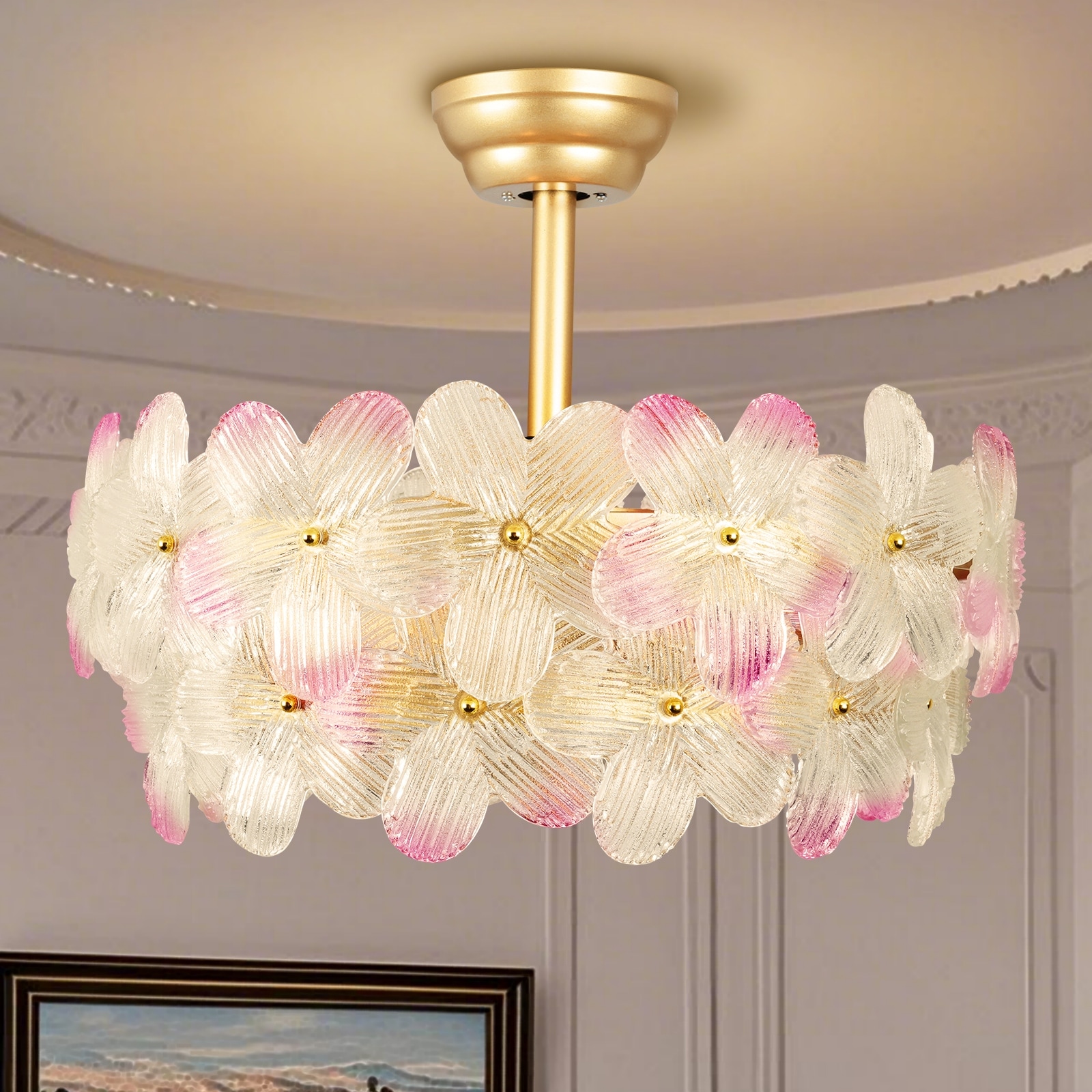 22 in. Indoor Gold Glass Flower Ceiling Fan with Light, Caged Fandelier with Remote Control, 6 Speeds for Bedroom
