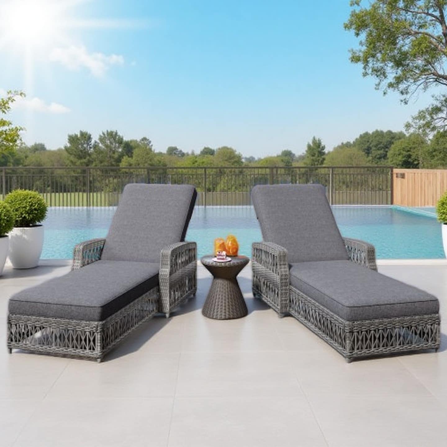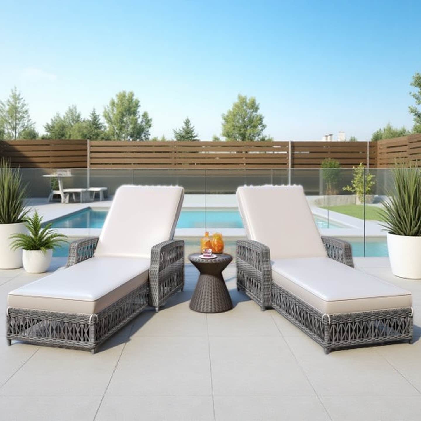 Description: Relax in style with this 3-piece pool lounge chair set, featuring two ergonomic chaise lounges and one matching side table.