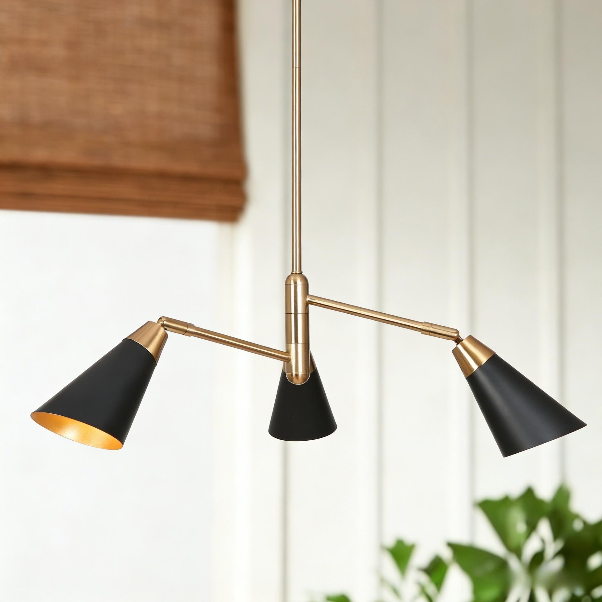 Add a sleek, modern touch to your room with this 3-light adjustable chandelier. Featuring black and gold finishes, its minimalist metal frame and conical shades create a sophisticated yet understated look.