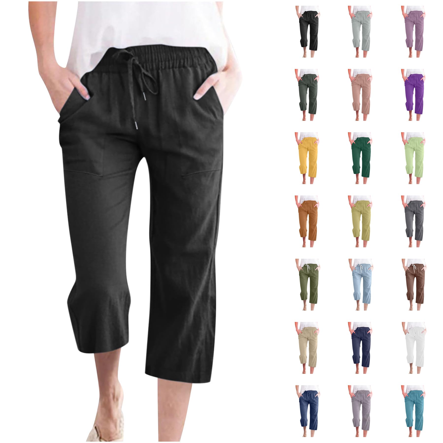 Womens Summer Capri Pants Casual Cotton Linen Tapered High Waist Drawstring Cinch Bottom Loose Trouser with Pockets