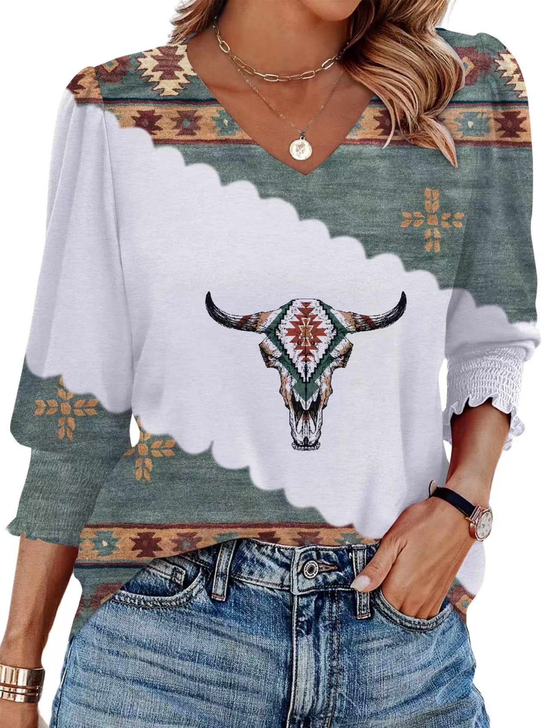 Womens Western Shirts 3/4 Length Sleeve Casual V Neck Western Graphic Cowboy T Shirts for with Smocked Cuffs Western Tops for