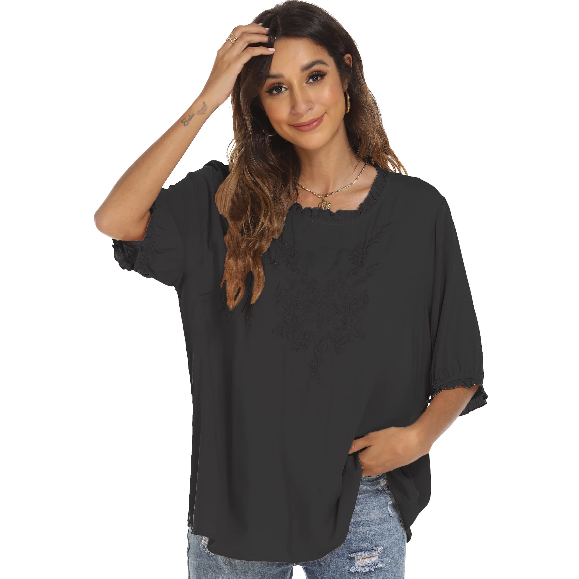 Grosy Women's Embroidered Plain Tunic Tops for Summer Fall Spring, Simple Elegant Dressy Blouse Casual Embroidery Solid Shirt