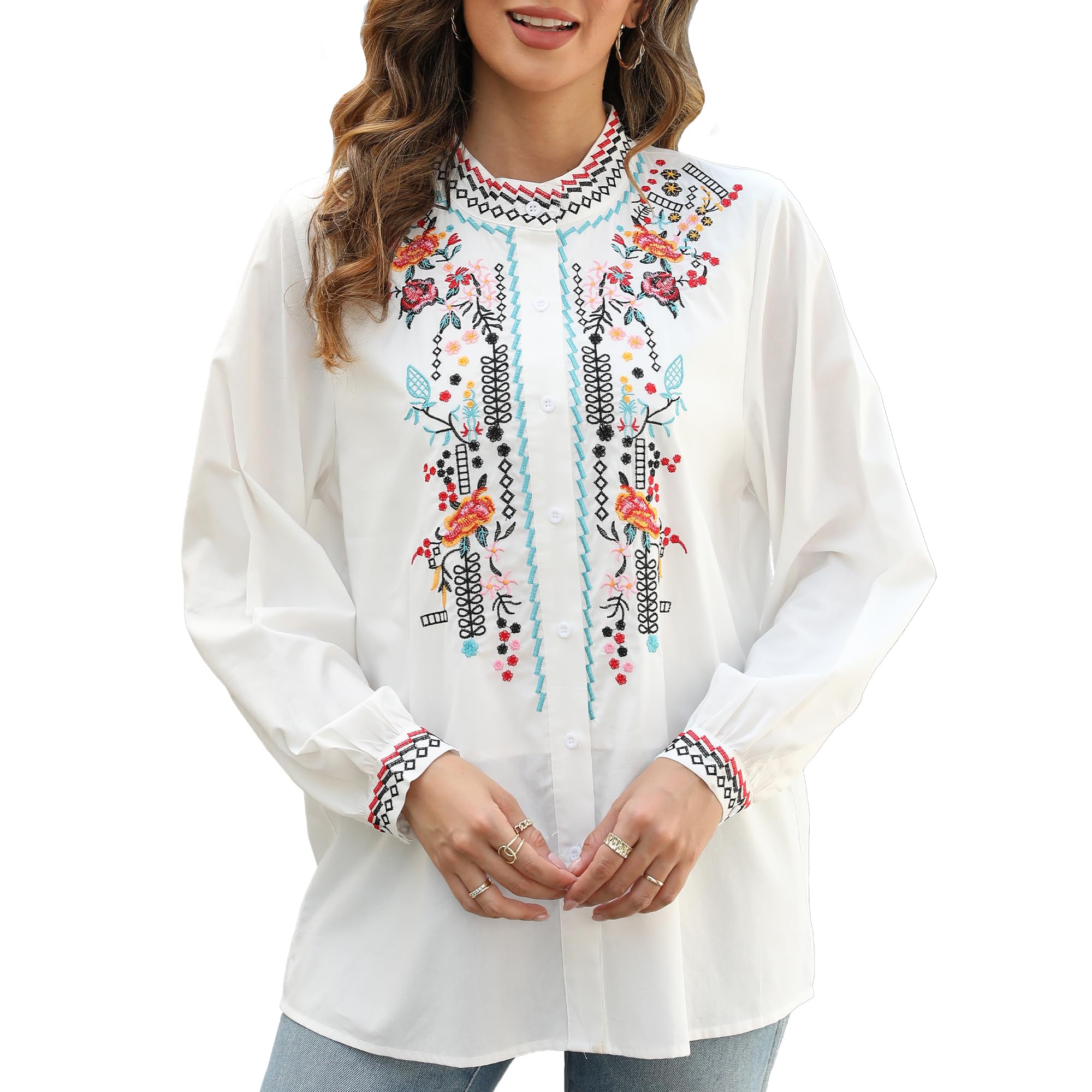 Grosy Long Sleeve Traditional Mexican Peasant Blouses for Women Embroidered Boho Tops Button Down Shirts Casual, Fiesta