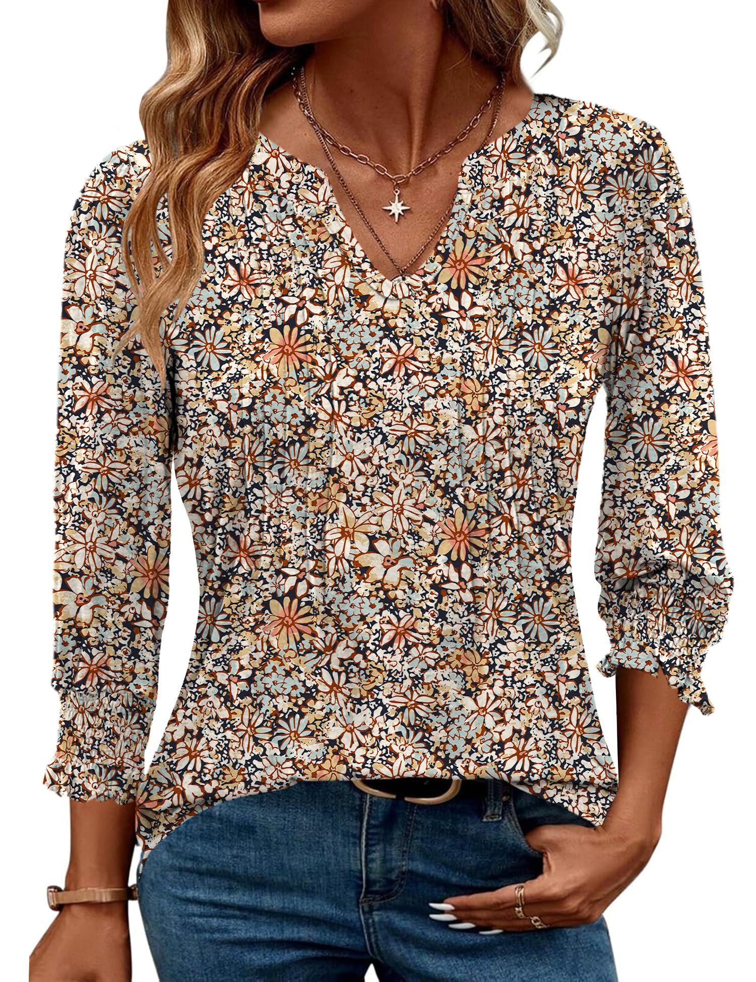 AKEWEI Blouses for Women Dressy Casual 3/4 Length Sleeve Spring Tops for Women V Neck Pleated T Shirts