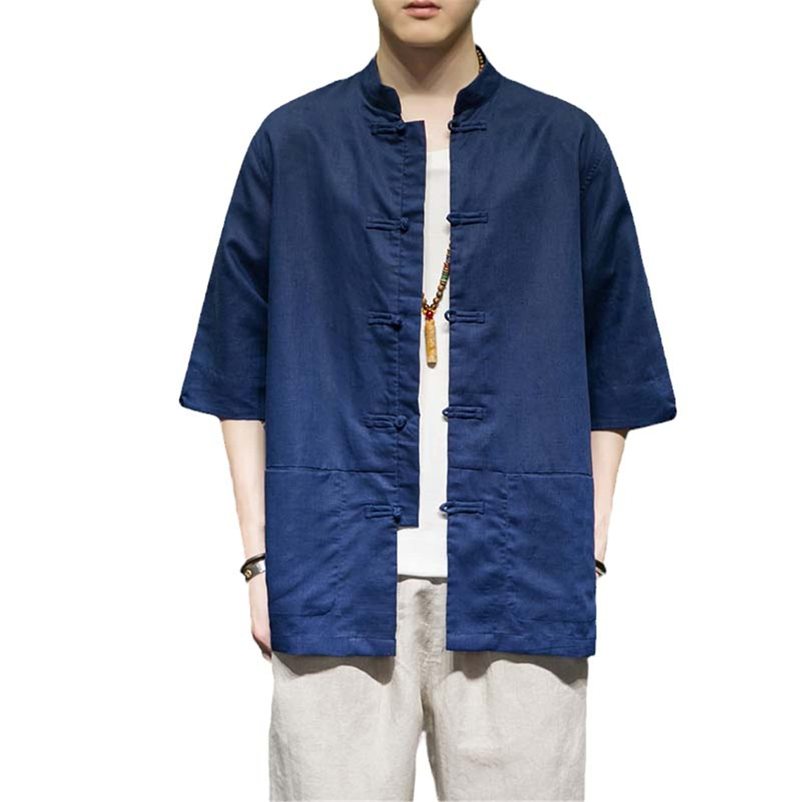 Mens Chinese Tang Suit Three Quarter Sleeve Vintage Shirts Traditional Kung Fu Tops Shirt for Men Hanfu Hemp Shirt