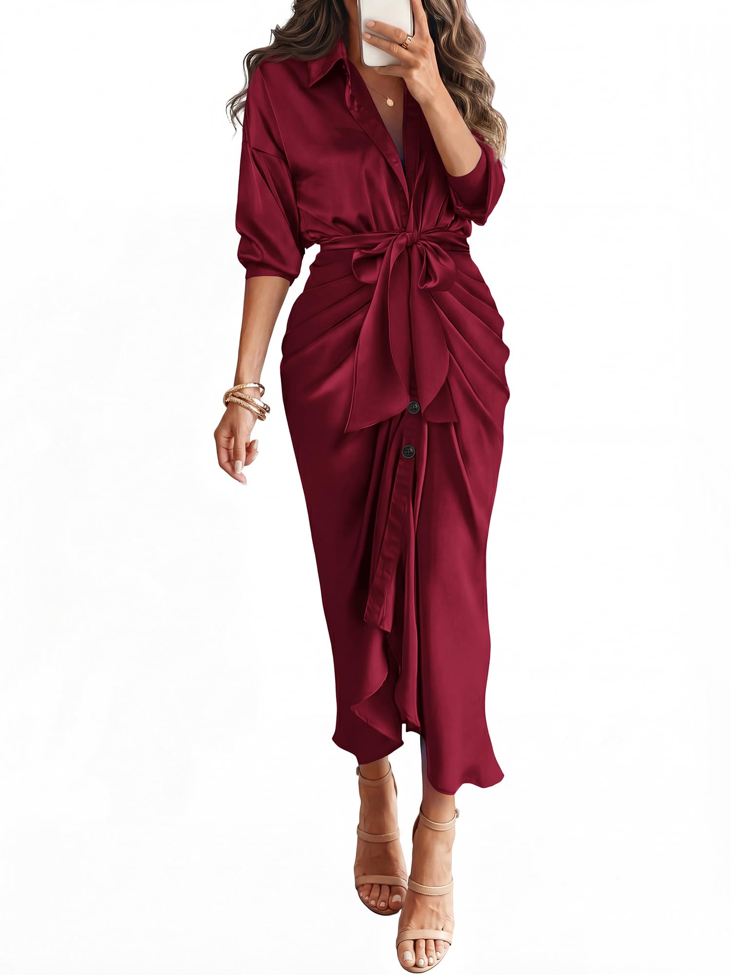 FEATURES: Shirt Dresses For Women / Long Sleeve Dress For Women / Maxi Dress / Silk Satin Dress / Sleeves End with Button Cuffs / Button Down / Lapel V Neck / Tie Waist / Ruched Dresses For Women / Solid Color / Fits For Spring, Summer, Fall MATERIAL: Due To Soft And Breathable Satin Material, The C
