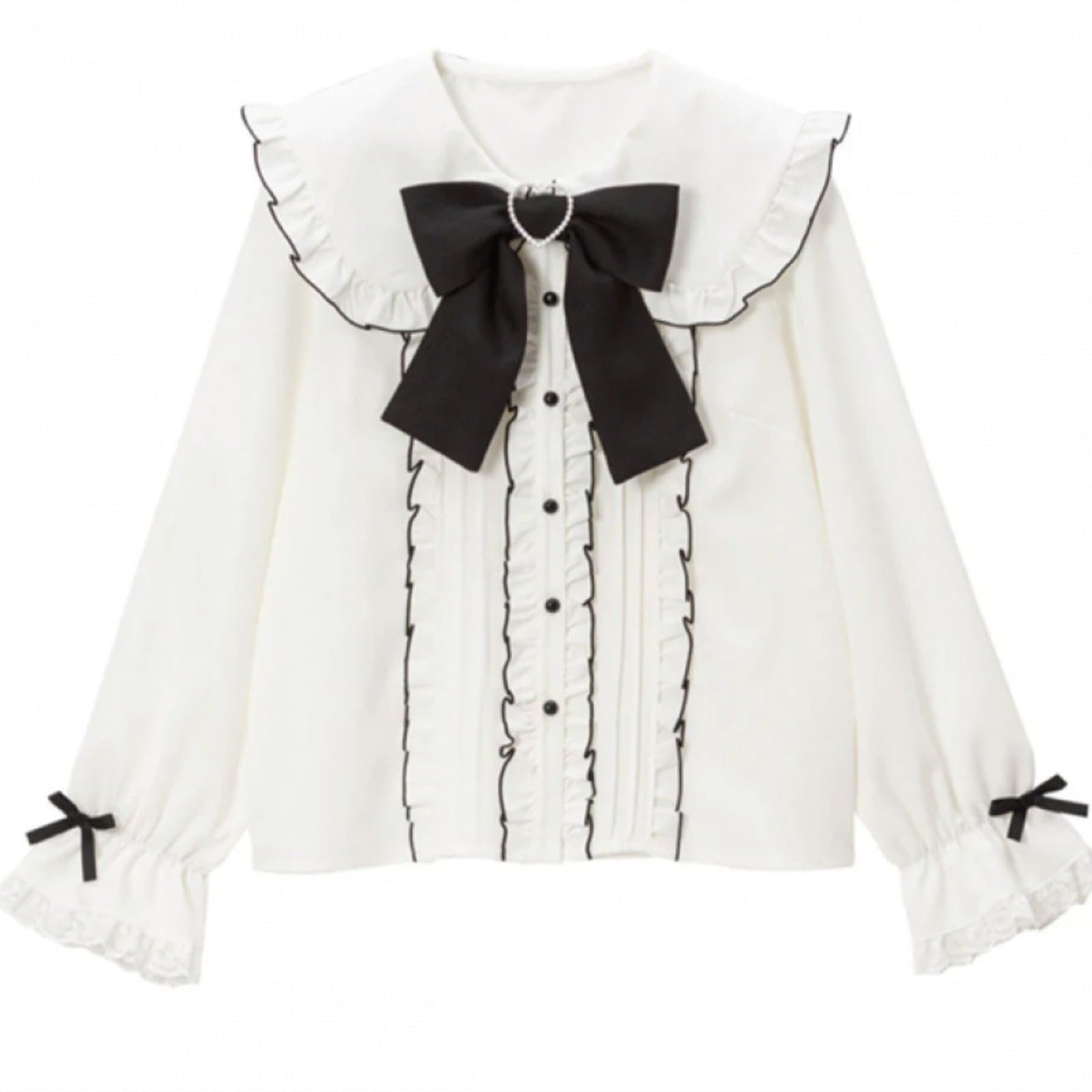 "Victorian-inspired" - This term emphasizes the historical roots of the Lolita fashion, which often takes inspiration from the Victorian era, featuring high collars and ruffled accents. "Ruffled detailing" - The blouses have prominent ruffles along the collar, sleeves, and front, which are character