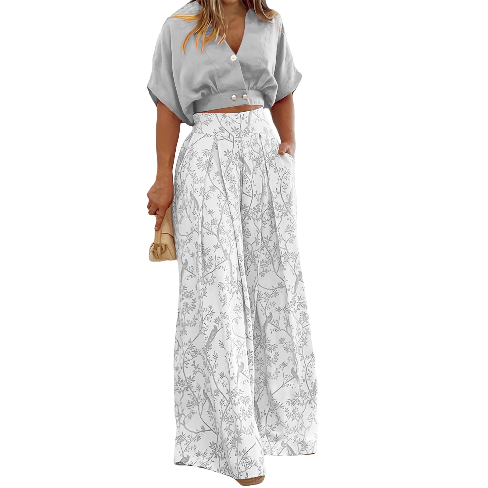 Summer 2 Piece Sets for Women Fashion Casual Short Sleeve V Neck Tops Matching Print Wide Leg Pants Set Business Suit