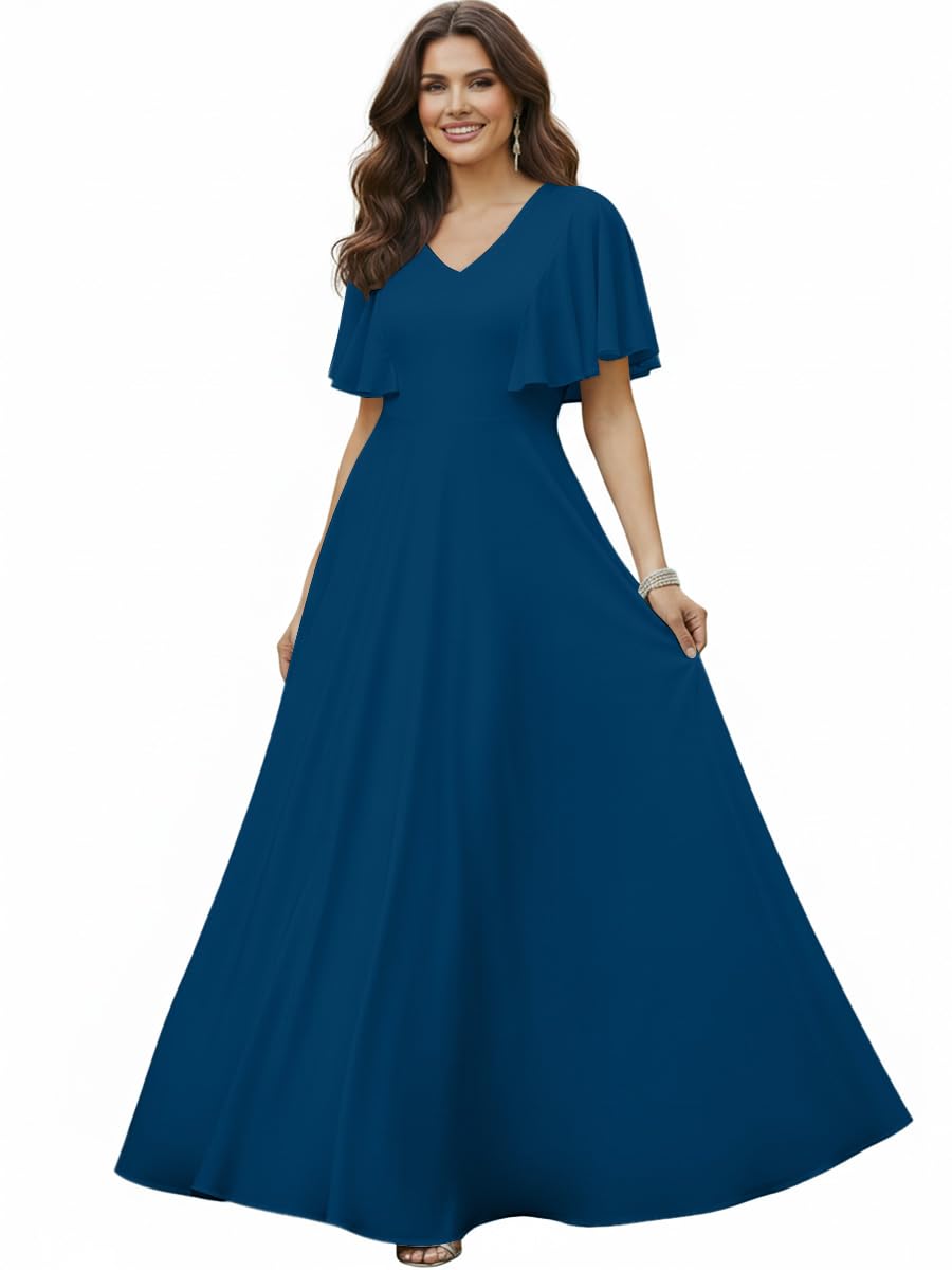 Plus sized full figure womans dress; loose fitting big size dresses for curvy ladies; cute Capri Blue comfy; classy flowing wrinkle free clothes; warm evening maxi dress for women with curves; comfortable stretchy clothing; dressy ball gown V-neck flattering gown; stunning A-line Capri Blue dress; c