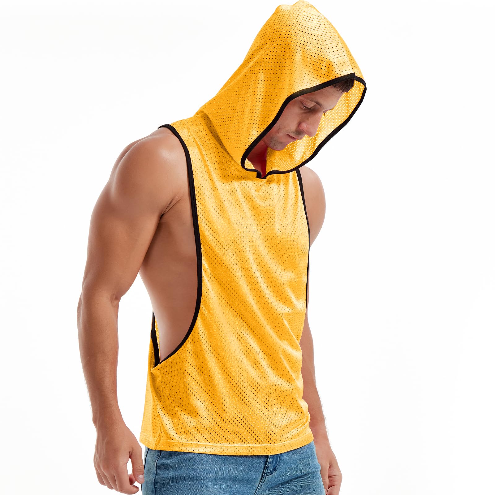 FEATURES - Stylish sleeveless mesh hoodie in bright pink and rainbow colors makes you stand out in the crowd, show your personality to people. Special cut and sleeveless design accentuates your shoulders and arms, muscle-baring design lets you release unlimited manly charm. DESIGN - Hoodie and Y-Bac
