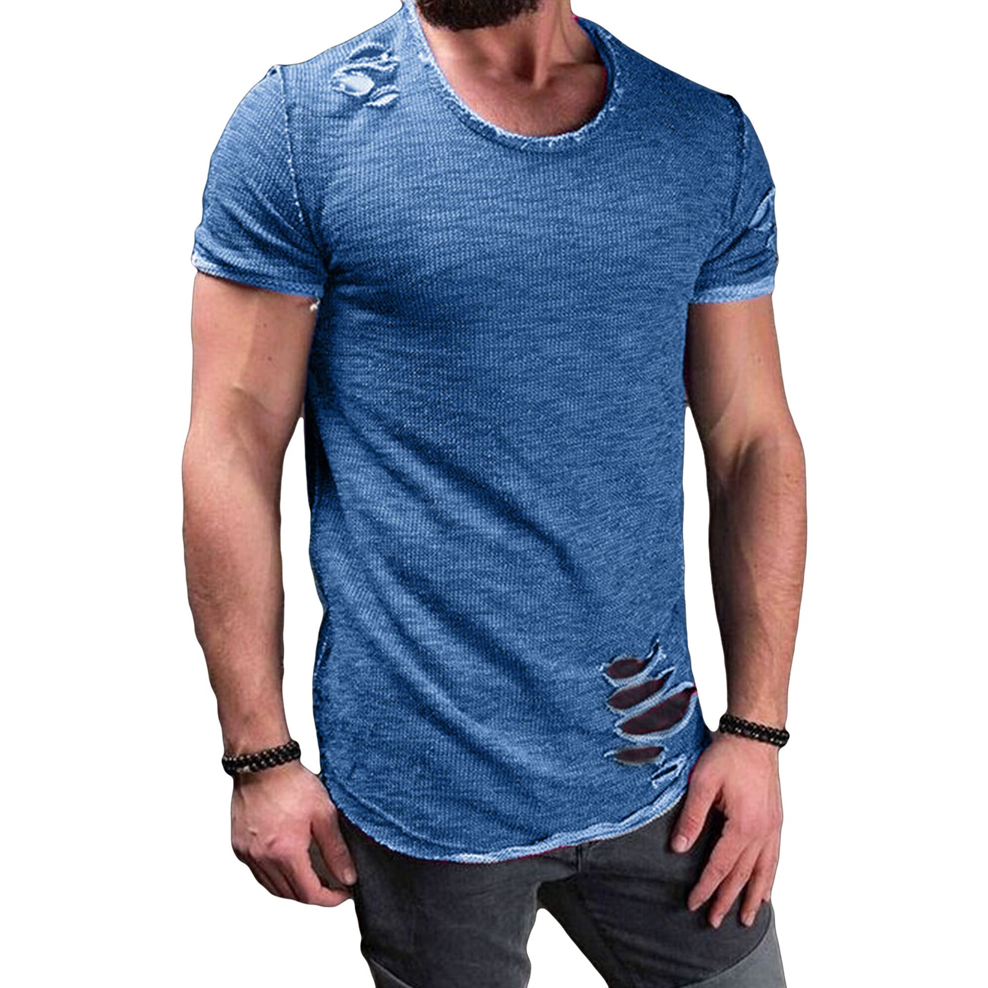 JEsilunmaMY Men's Casual Distressed Ripped T-Shirts Short Sleeve Crewneck Hip Hop Hole Tees Solid Color Workout Gym Shirts