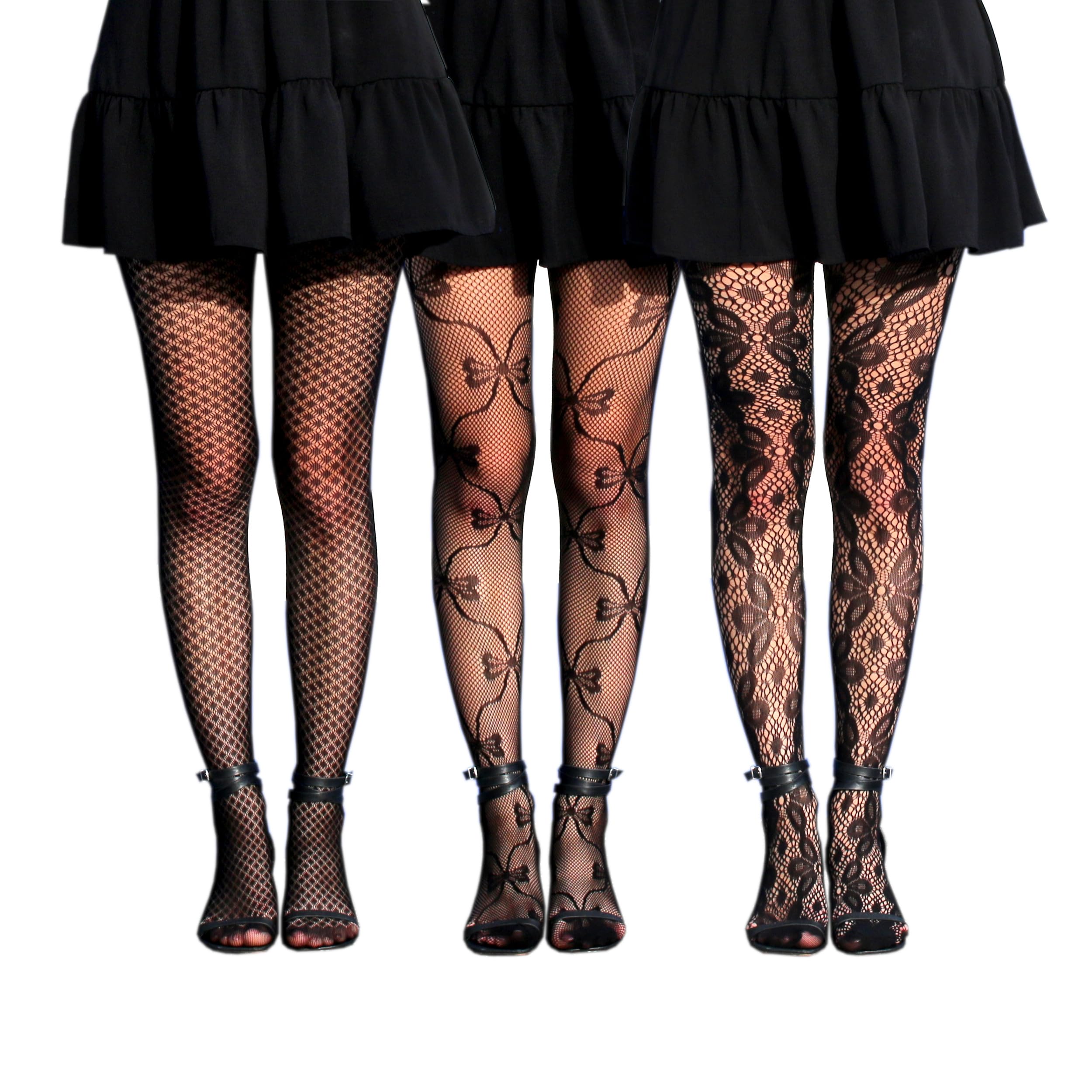 Millennials In Motion 3 Pairs Patterned Bow Herringbone Floral Fishnet Tights Butterfly Fairy Daisy Textured Designer Pattern Fish Net Pantyhose 90s