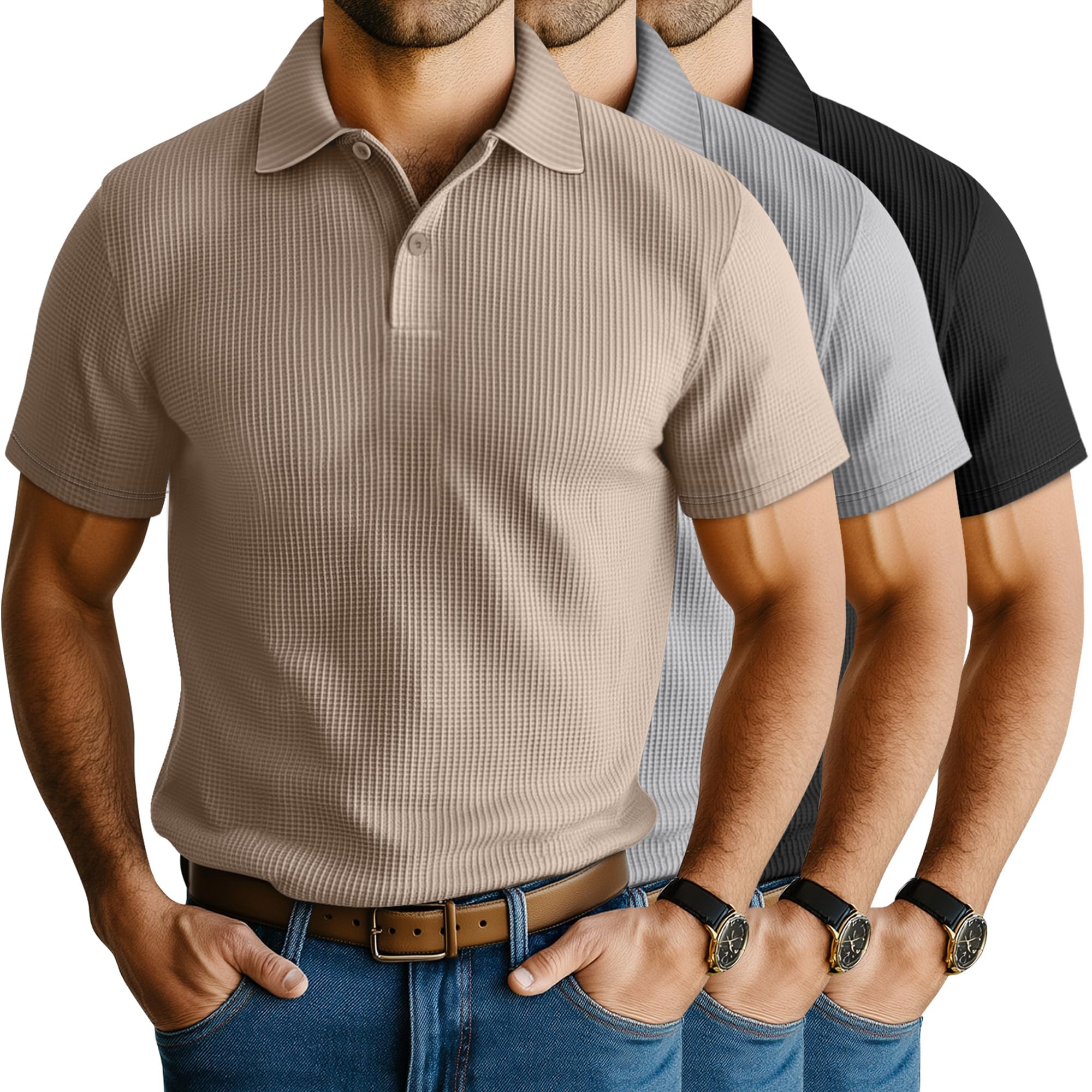 Neer 3 Pack Men's Waffle Henley Button Collared T-Shirts, Short Sleeve Lapel V Neck Side Split Classic Summer Basic Tees