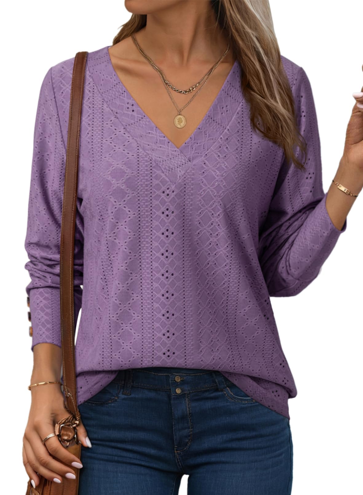 Features: Long Sleeve Shirts/V Neck Casual Tops/Eyelet Embroidered Tops For Women/Ladies Tops and Blouses/Business Casual Outfits/Trendy Fashion Tops/Spring/Summer/Fall Outfits/Hollow Out Tops for Women Details: Women blouses are designed with eyelet embroidered details,buttons inon the sleeve cuff