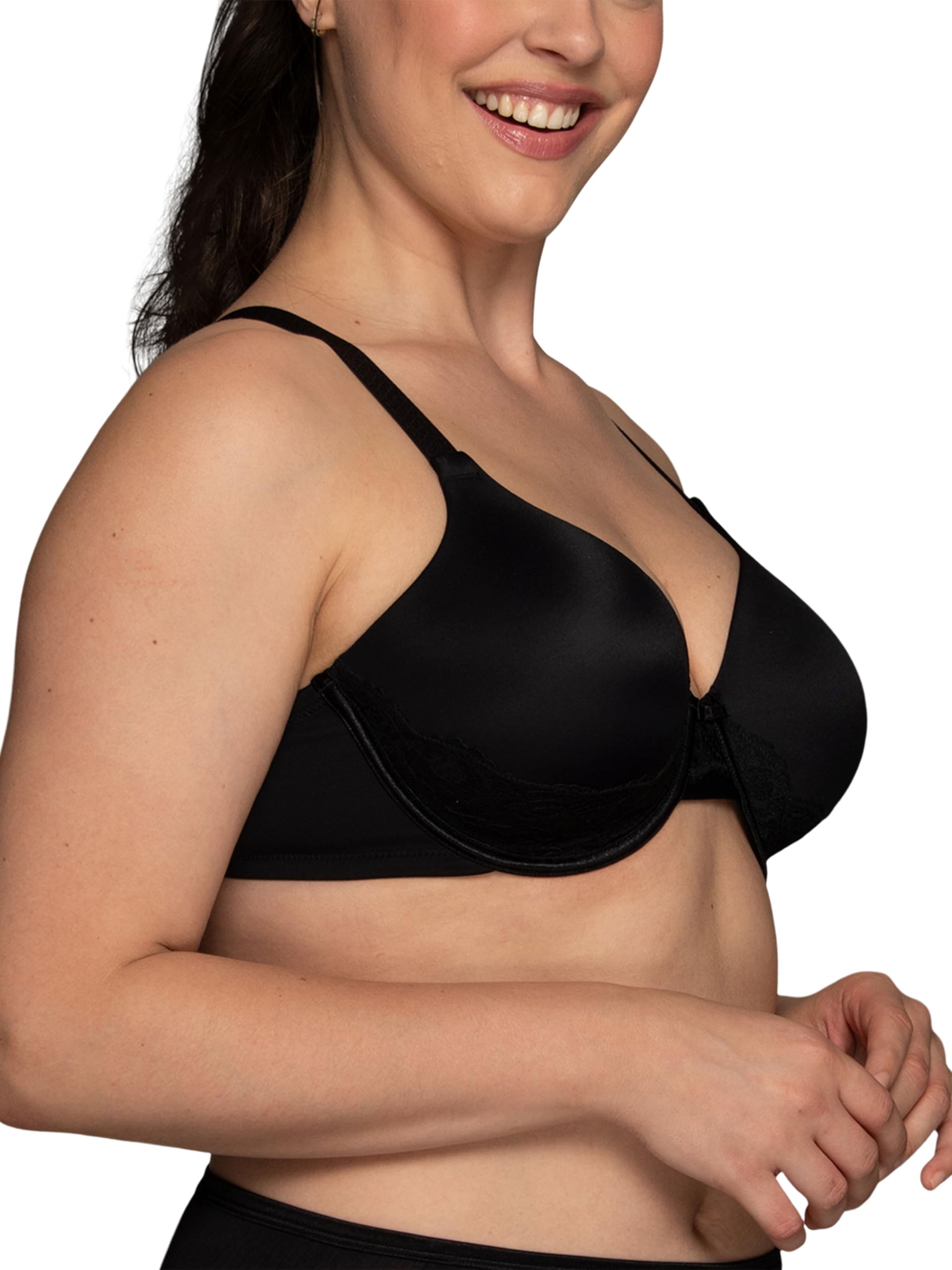 Full-coverage contour bra with underwire featuring enhanced side coverage and elastic-free sides and back for streamlined look under clothing Front-adjustable straps Triple hook-and-eye closure