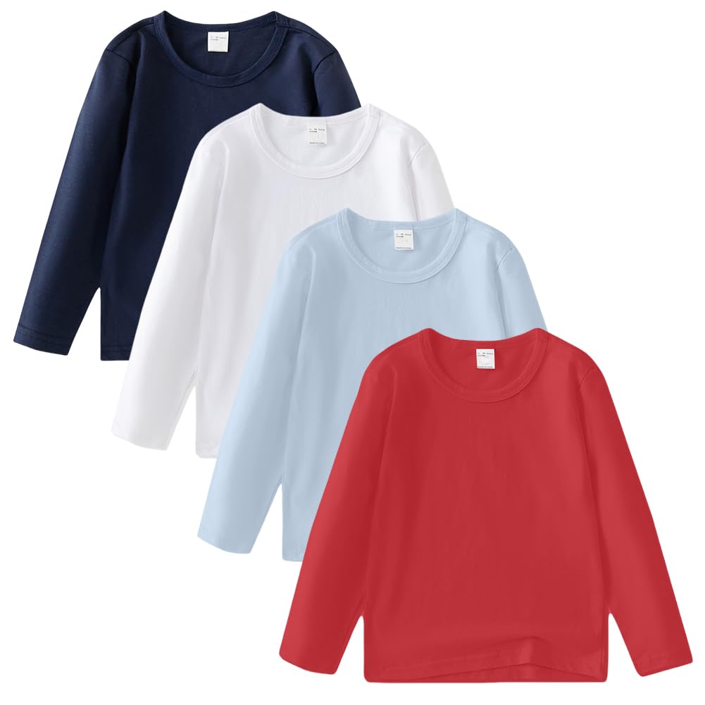 Package includes: You will receive 4 packs of boys/girls/toddler long-sleeve Shirts in different colors. Fabric: The Shirt is made of 100% Cotton. Features: Our material is never shrink or color fading by using good technology. Occasions:The basic Tee top can be worn outdoors for running, playing, a