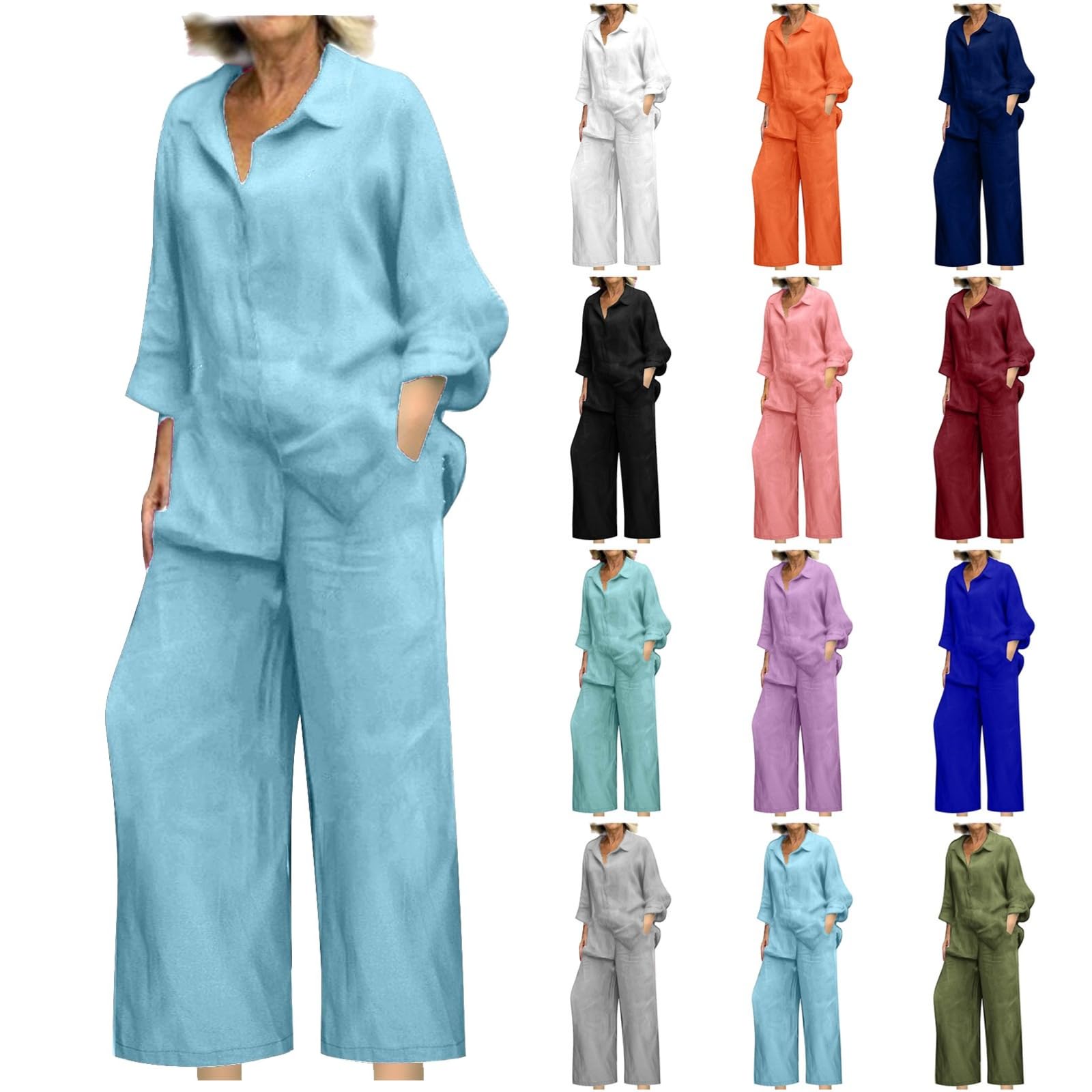 2 Piece Sets for Women Summer,Outfits for Women 2 Piece Sets Long Sleeve Shirts & Wide Leg Trousers Loose Fit Dressy Cotton Linen Sets Outfits 2025