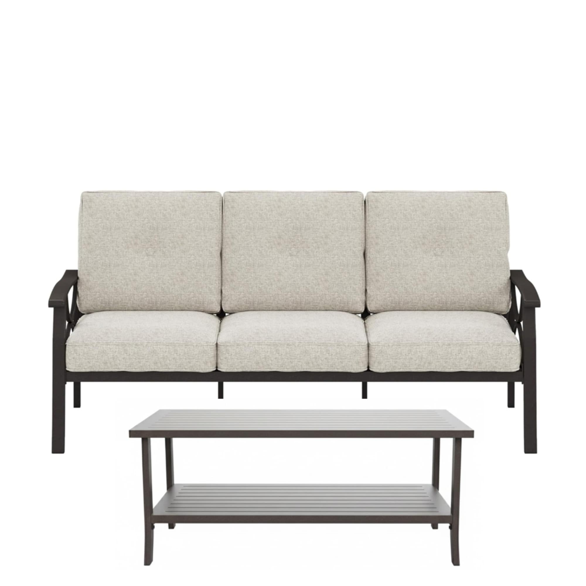 Create a luxurious outdoor lounge with this complete 2-piece all-weather patio set, featuring a spacious 70" 3-seat sofa in elegant khaki with plush gray cushions and a matching 37" x 21" rectangular metal coffee table in rich brown tones.