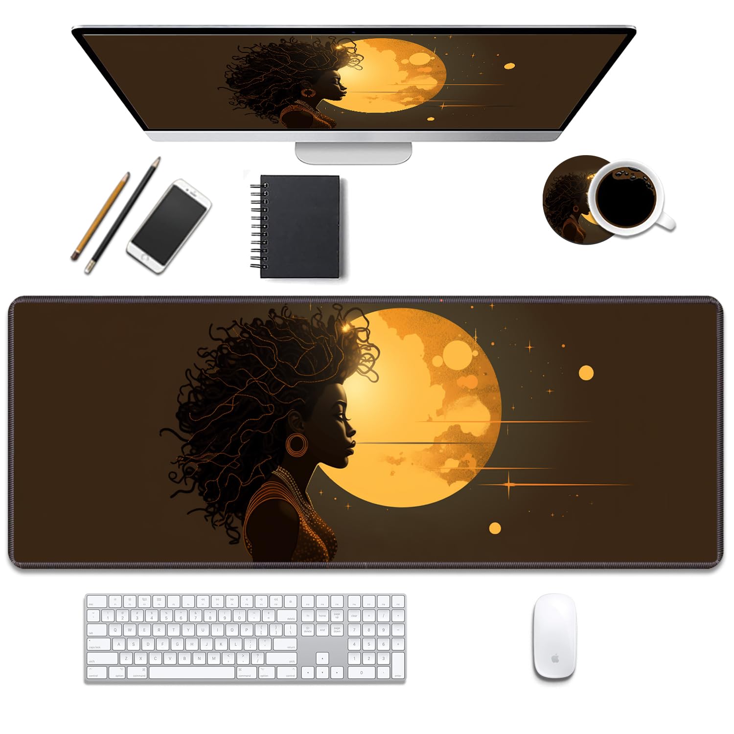Desk Pad Mat Gaming Mouse Pads with Coasters Set, Stitched Edges Design Mouse Pad XL Large Mouse Pad for Laptop Computers Cute American Fashion Girl