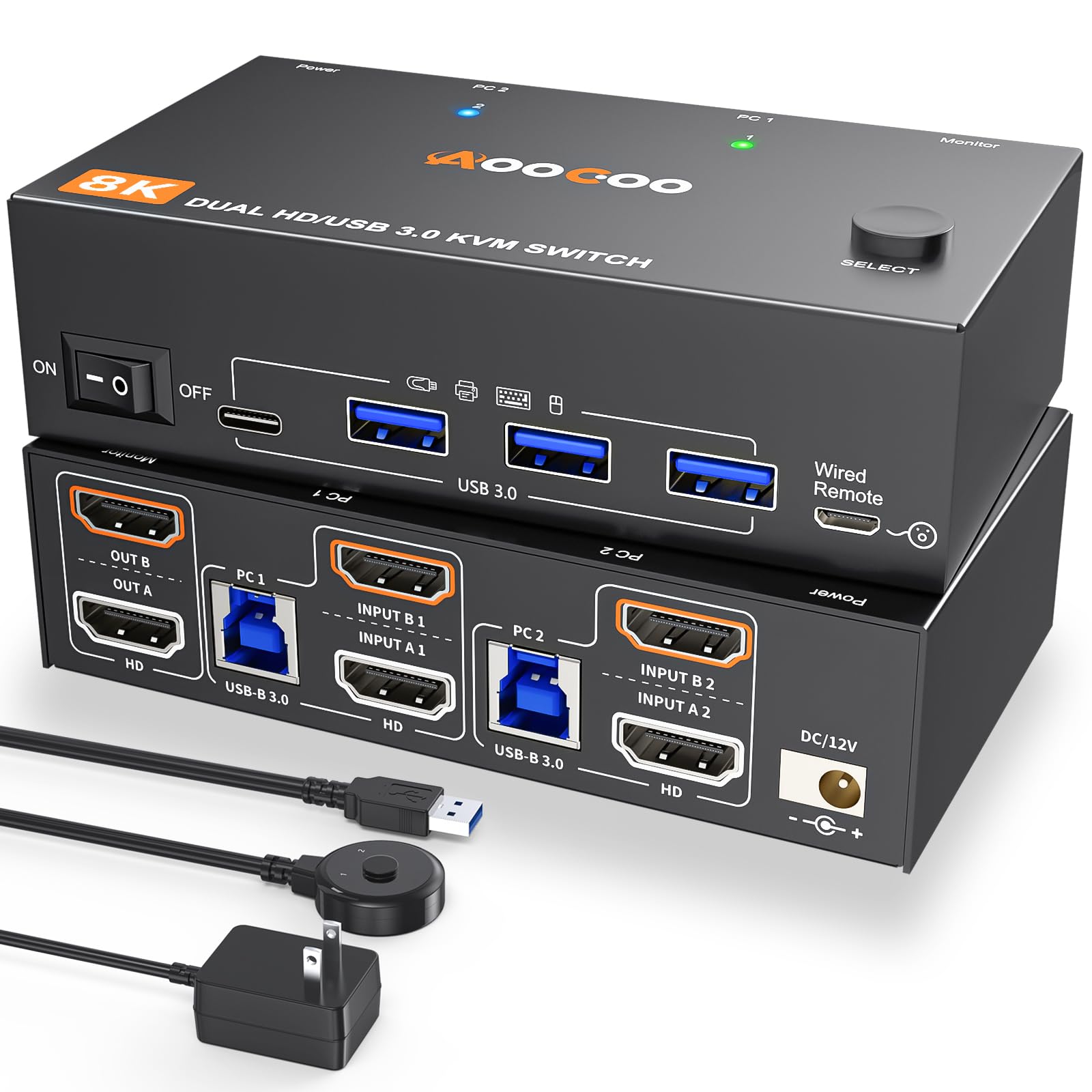 KVM Switch 2 Monitors 2 Computers 8K@60Hz/4K120Hz,HDMI USB3.0 Dual Monitors KVM Switches with 4 USB 3.0 Port,Wired Remote,USB3.0 Cables Included(8K 2