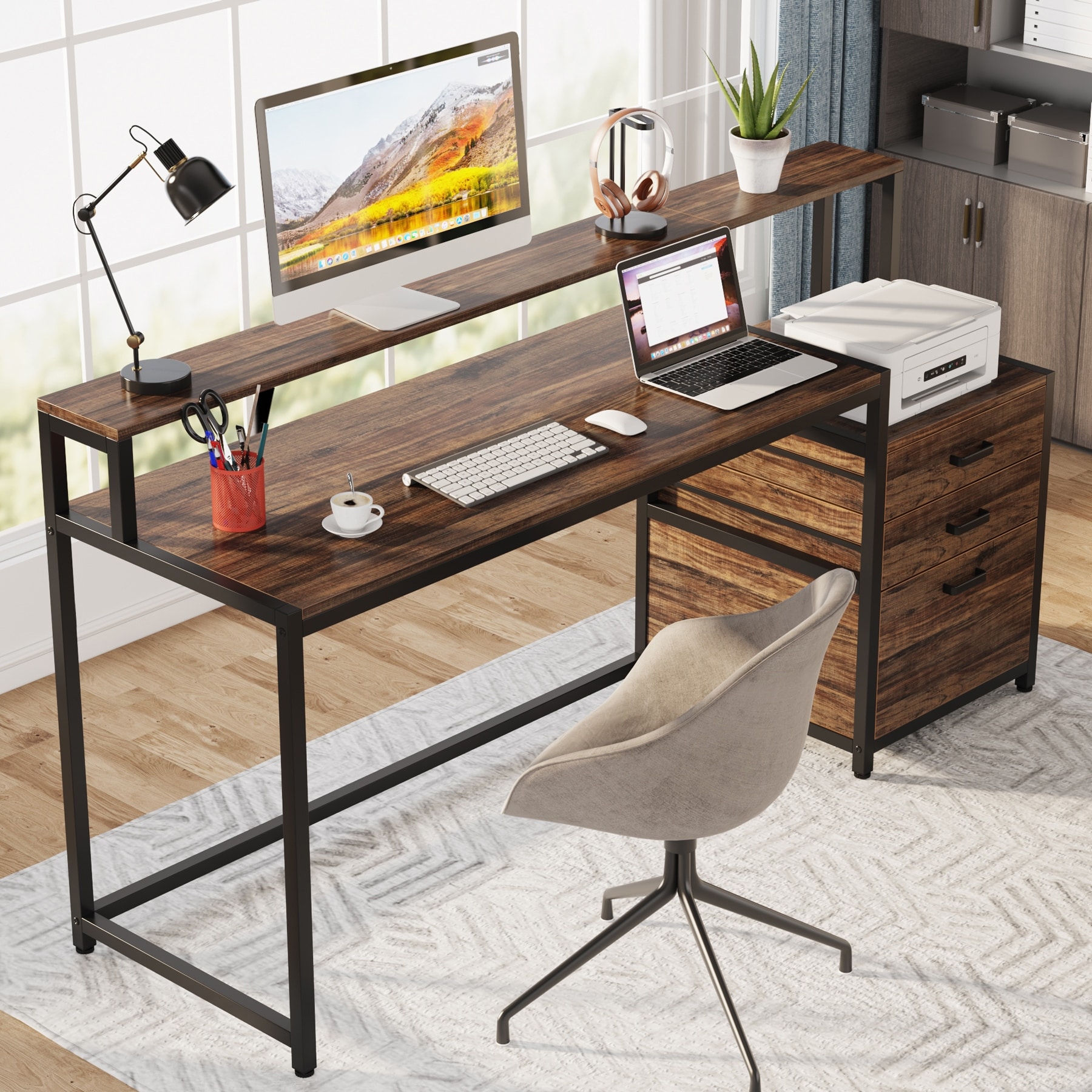 63 Inch Computer Desk with File Drawer, Ergonomic Office Desk with Monitor Stand, Industrial Computer Table with Printer Space, Wood PC Table Workstation Desks for Home Office Features: Specifications: Material: Premium Particleboard + MDF Board + Steel…
