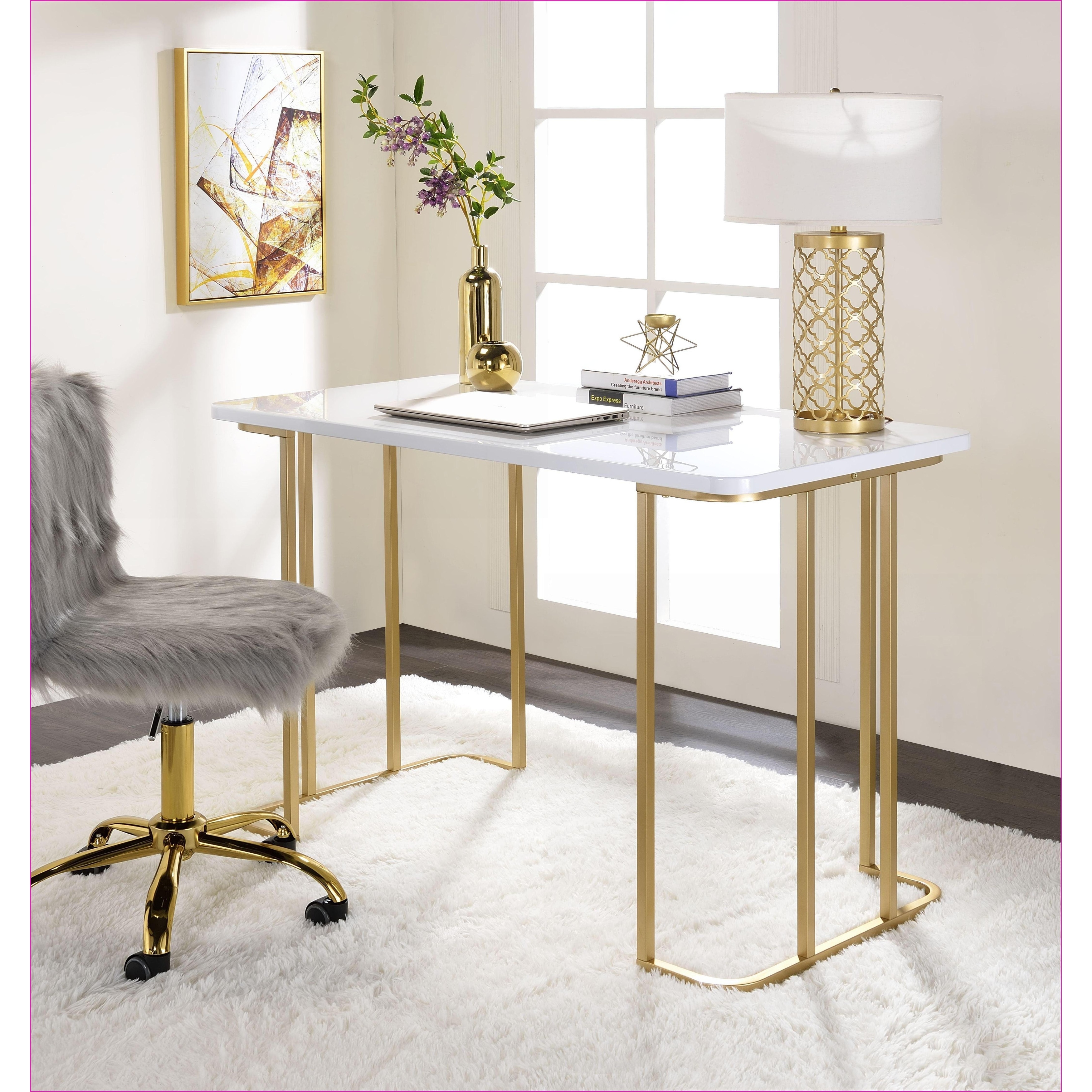 Desks, Modern White and Gold Rectangular Writing Desk with Open Base, Composite Wood, Metal