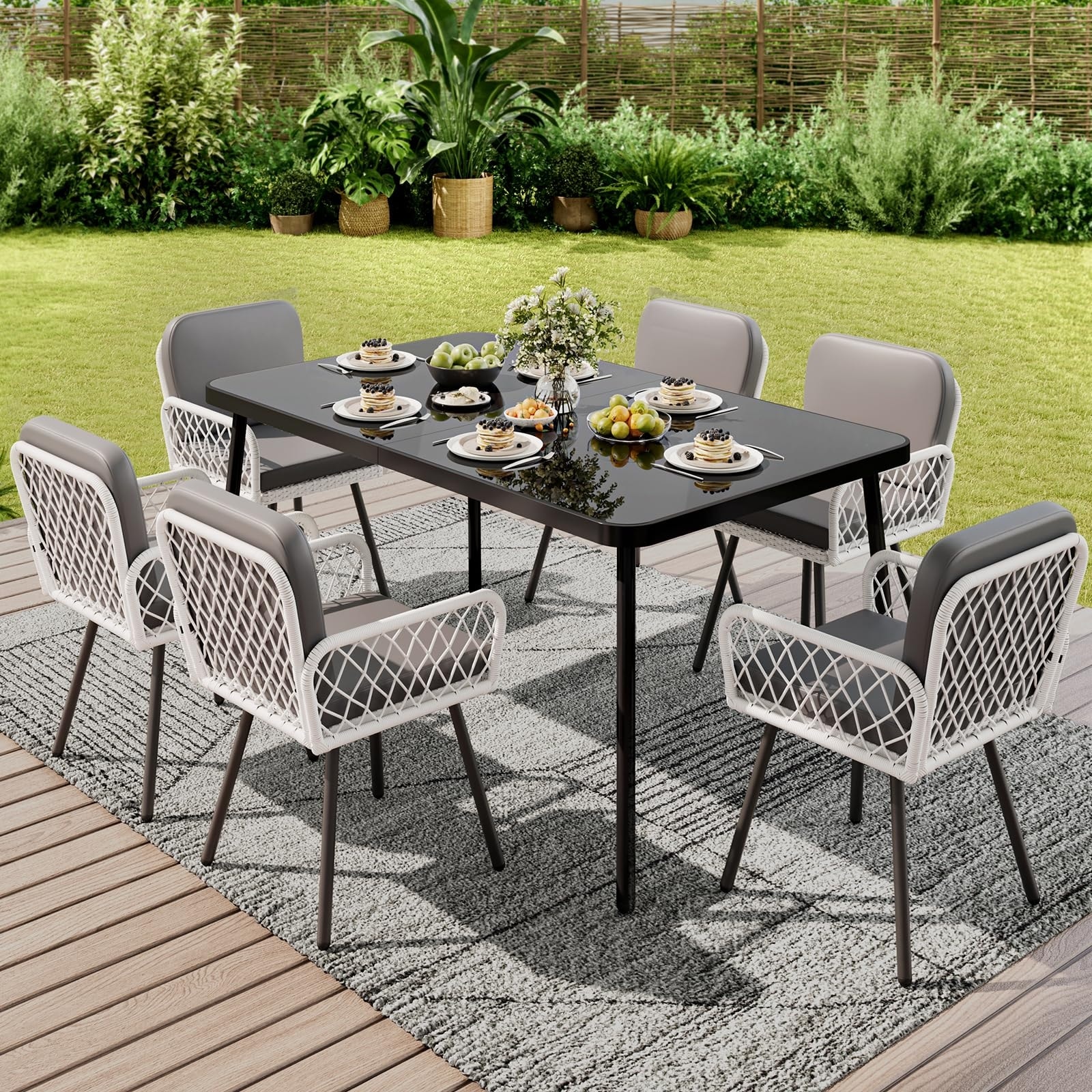 7-Piece Complete Outdoor Dining Set (6-8 Seats)-Including 1 large metal table (tempered glass top) and 6 diamond-pattern PE wicker chairs with gray cushions, this patio dining set creates an instant spacious dining area for family meals, BBQ parties or…
