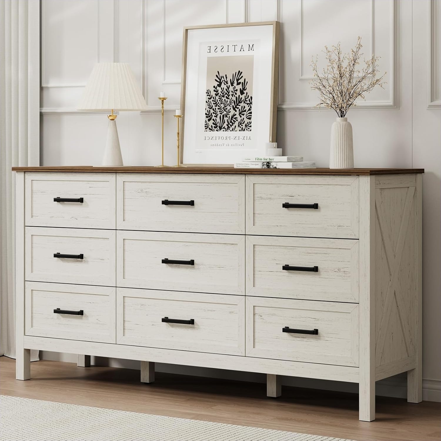 Rustic 9-Drawer Dresser, 55 Inch Wide Wooden Chest with Metal Handles, Antique White Finish for Bedroom or Hallway