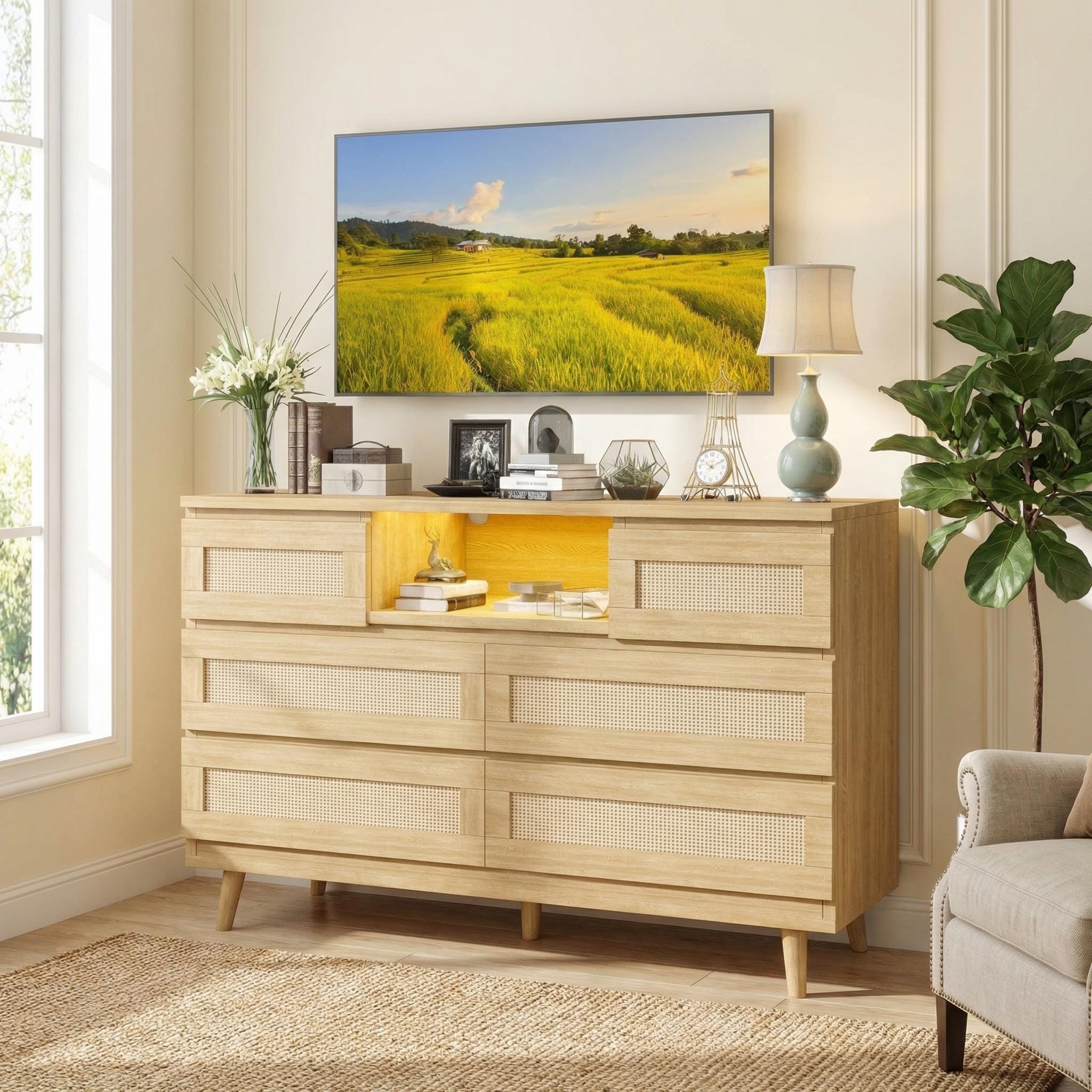 6-Drawer Rattan Dresser with LED & Charging Station