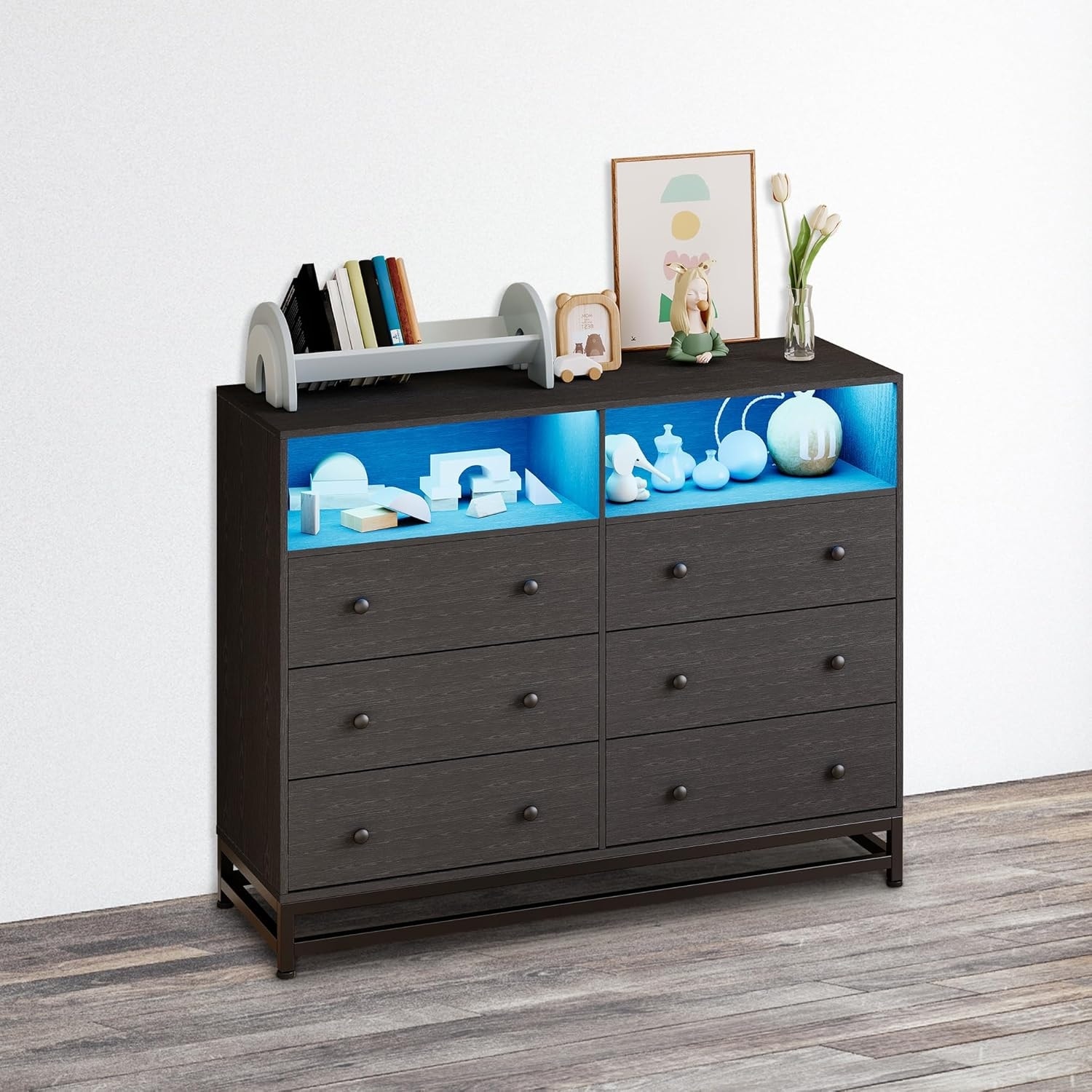 Modern dresser with 6 spacious drawers and customizable LED lights, featuring over 6000 RGB color options controlled via app or manual settings.