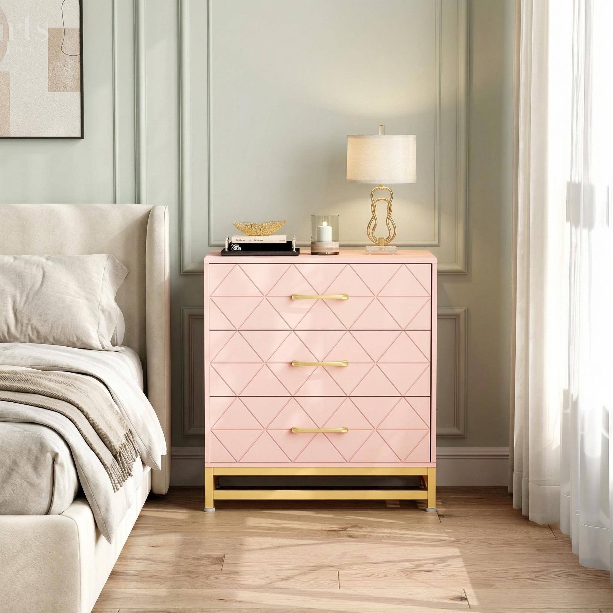 3-Drawer Dresser: There are 3 wide wooden drawers that slide easily on ball-bearing sliders, the gold-coated metal knobs allow you to push and pull the drawers without effort, keeping your clothes or other items neat and tidy. 35.4"x15.35" wide tabletop…