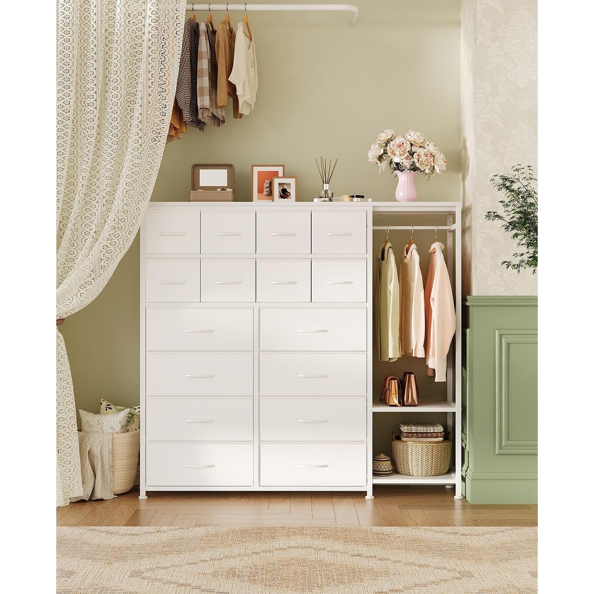 Space-Saving Design: Features a compact layout with 16 fabric drawers and 2 storage shelves, combining a wide dresser with drawers and a hanging rack to maximize your storage options for clothes, toys, books, and more.