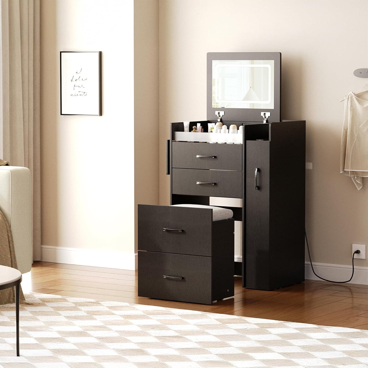 3-in-1 Vanity Desk with LED Mirror, Side Cabinet, Collapsible Panel, Hidden Stool, Power Outlets, Compact Design
