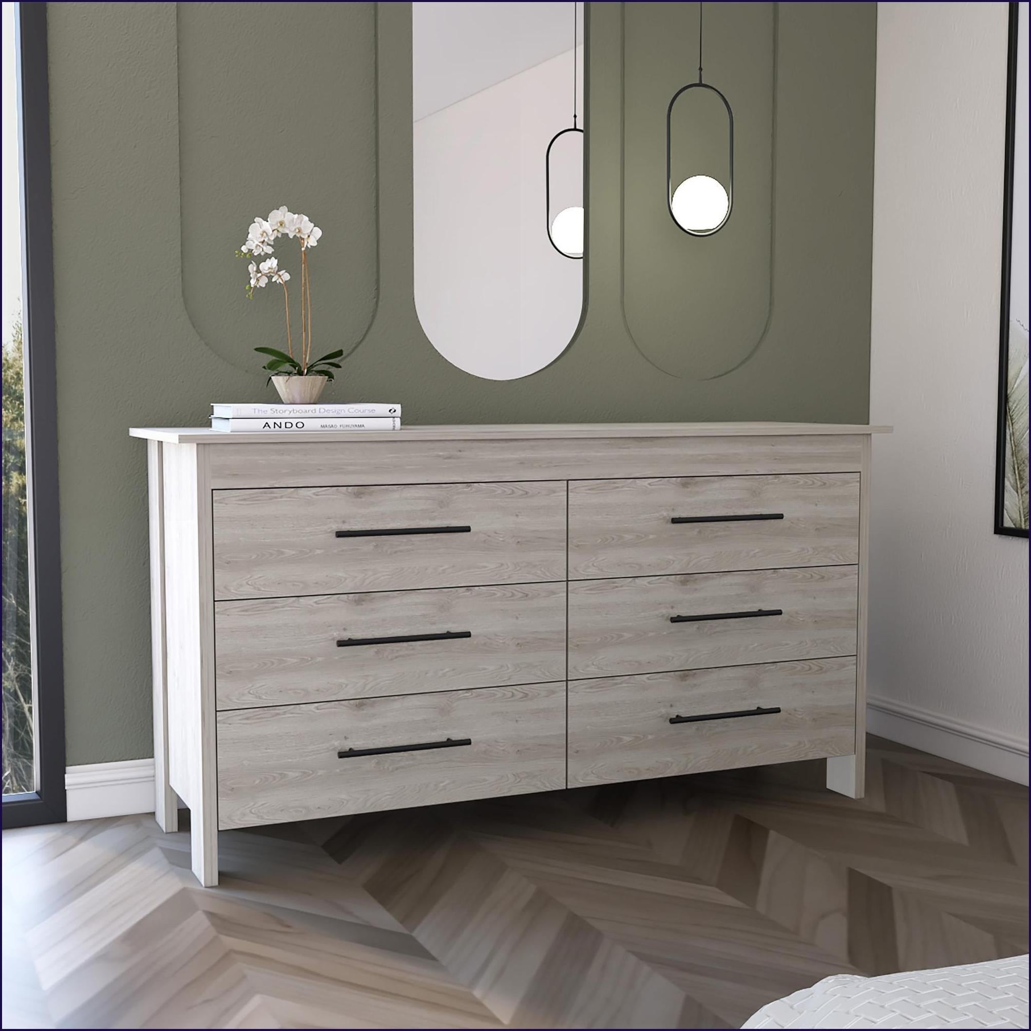 Keep your bedroom organized and stylish with this 6-drawer double dresser. The light gray finish blends seamlessly with any decor—modern, traditional, or farmhouse—while black metal pulls add a sleek, easy-to-grip touch.