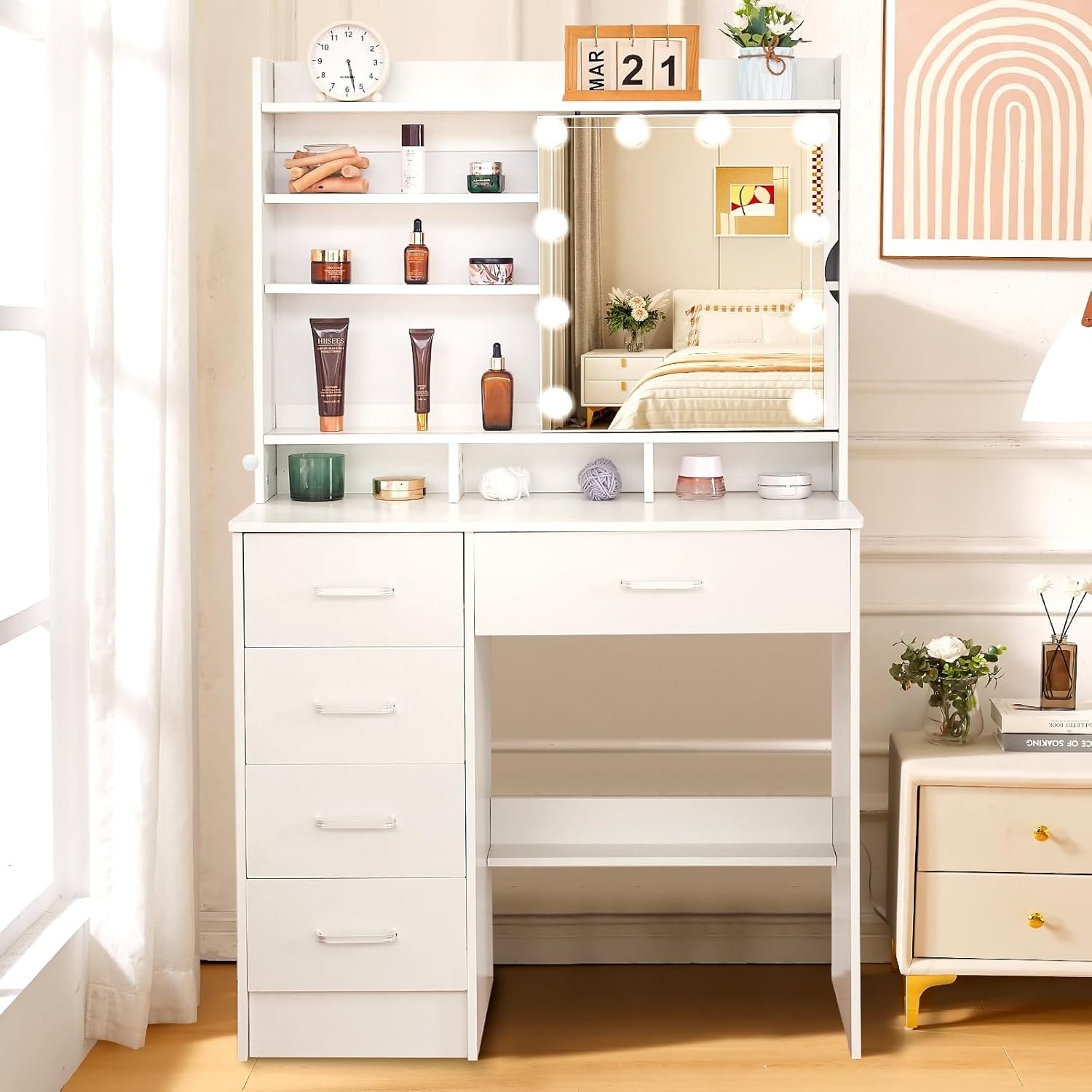 【Cute Vanity Desk】The makeup vanity bench (coming with a stool) overall size is 31.5(L) x 14.2(W) x51.5(H) in, it comes with one mirror with LED lights, 5 large drawers, a wide desktop, ensure that there is storage space in every place you reach with…