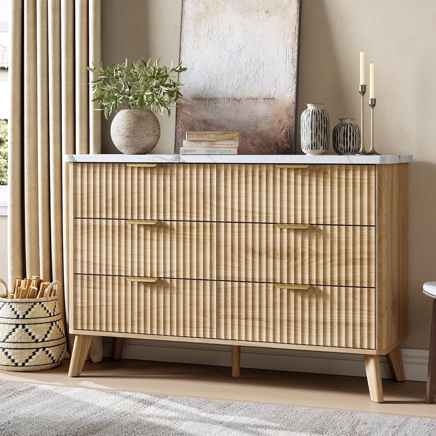 Modern Fluted 6-Drawer Dresser – Curved Profile, Gold Handles Storage Organizer