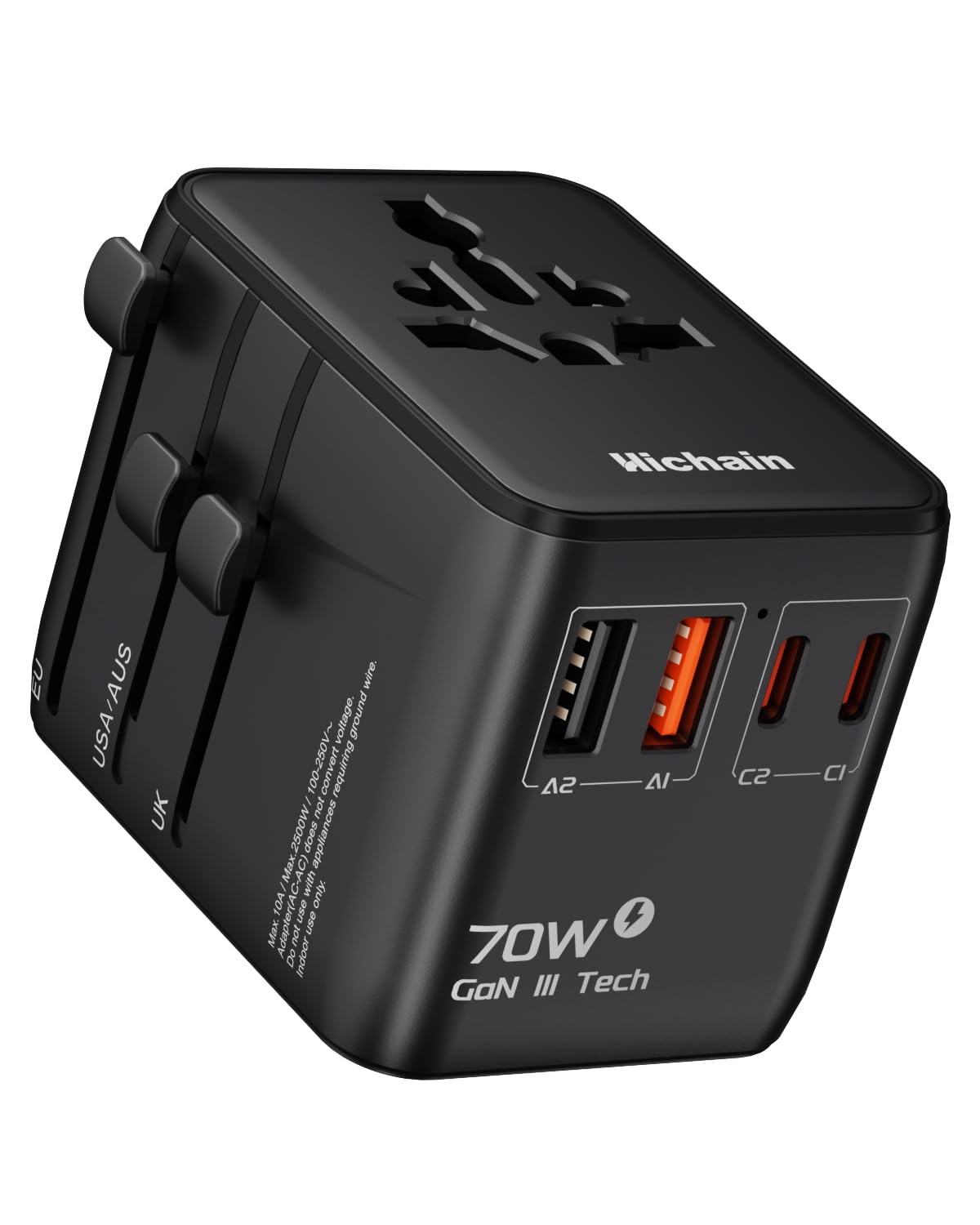 Hichain 70W GaN Universal Travel Adapter, European Travel Plug Adapter 2 USB-A & 2 USB-C Fast Charging Travel Adapter All-in-one International Power