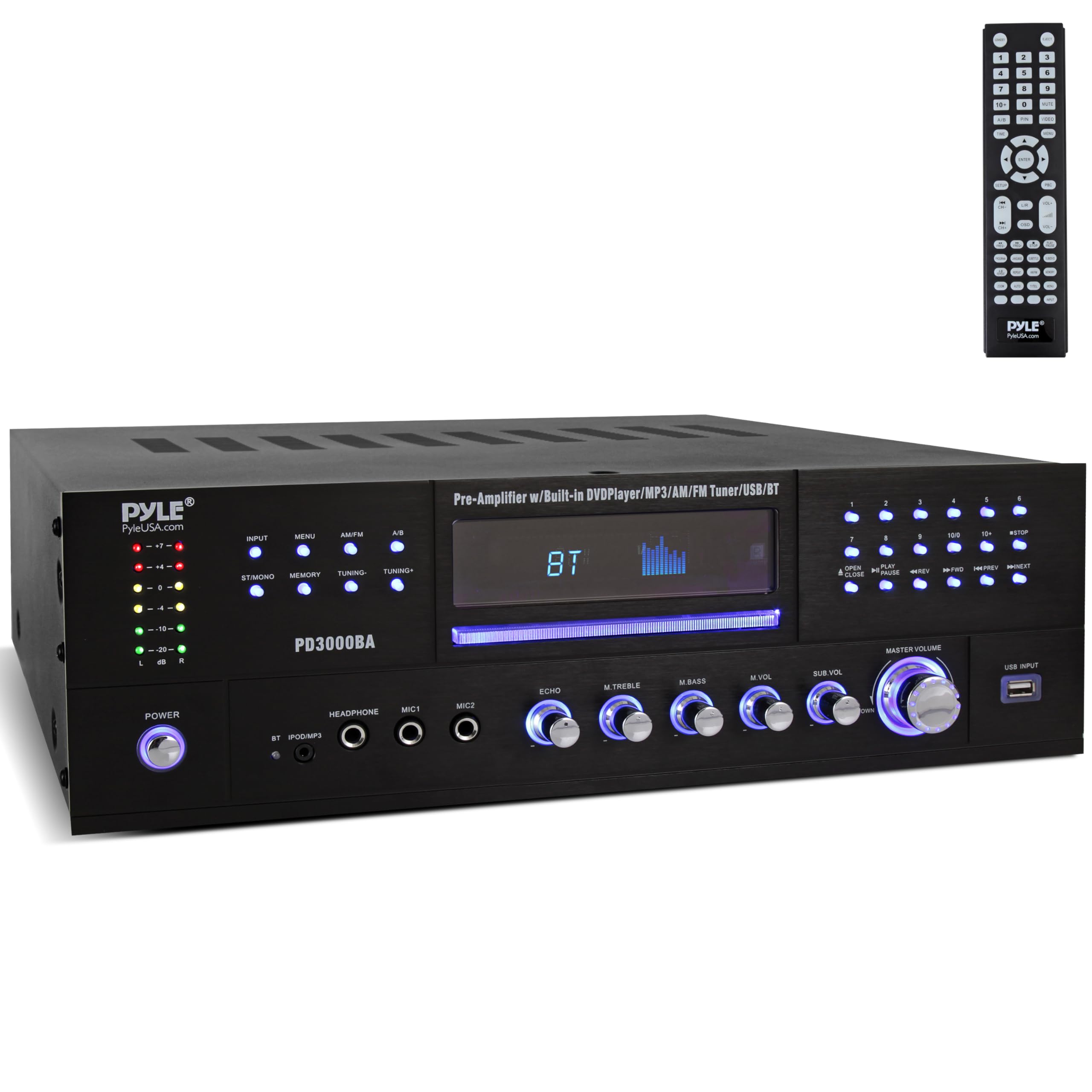 Pyle 4 Channel Bluetooth Home Amplifier - Front Loading DVD/CD Player - 3000W Peak Stereo Receiver - 2 Mic Inputs w/ Echo, FM Radio,Optical In,USB,RCA