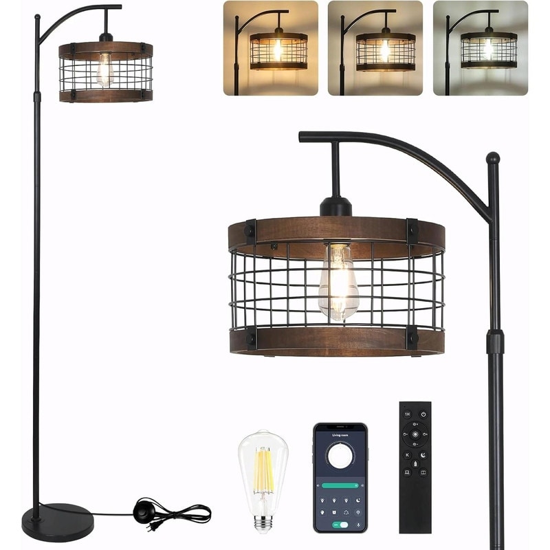 Features Rustic Farmhouse Style with Industrial Charm: This vintage tall floor lamp combines a solid wood accent with an iron fence-style lampshade and a sleek black curved pole, creating a warm farmhouse look with subtle industrial flair.