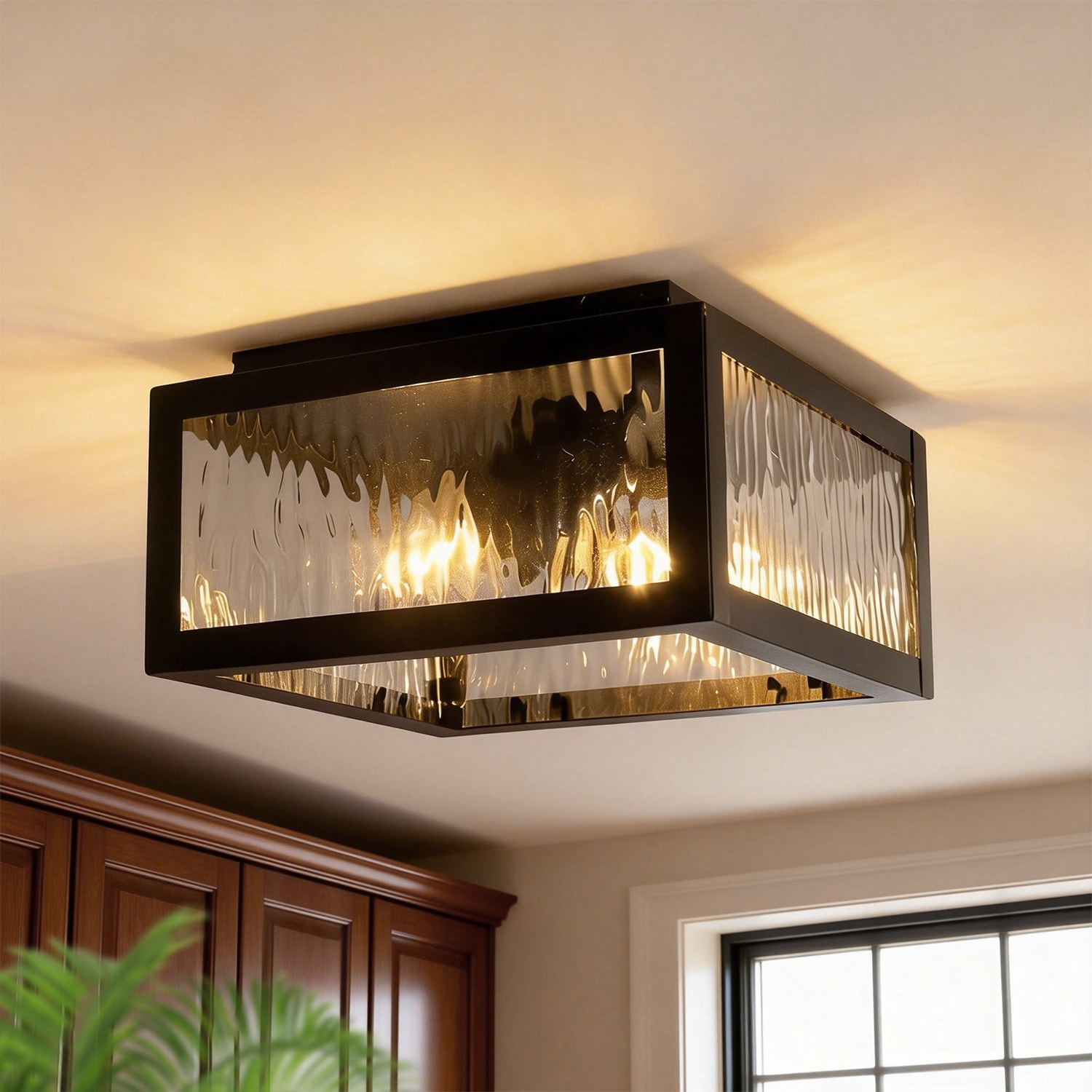 YANSUN Matte Black Ceiling Light 2 Light Flush Mount Light with Ripple Glass