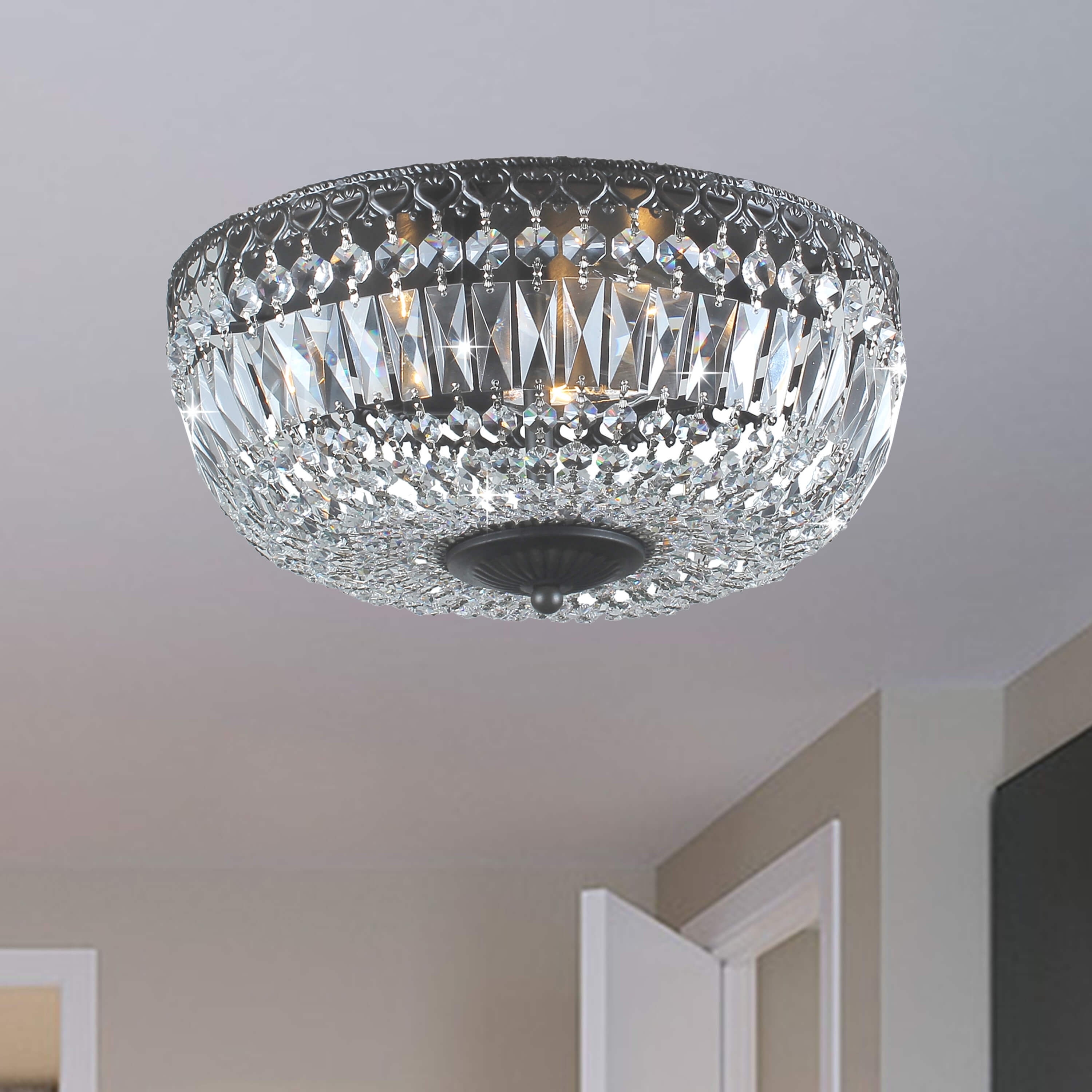 Illuminate your decor with the brilliant elegance of this flush-mount chandelier. Dazzling crystals scatter light to create a warm, glamorous glow, while the fixture for a sophisticated look in any space. Features: Available in 2 finish options: 1.
