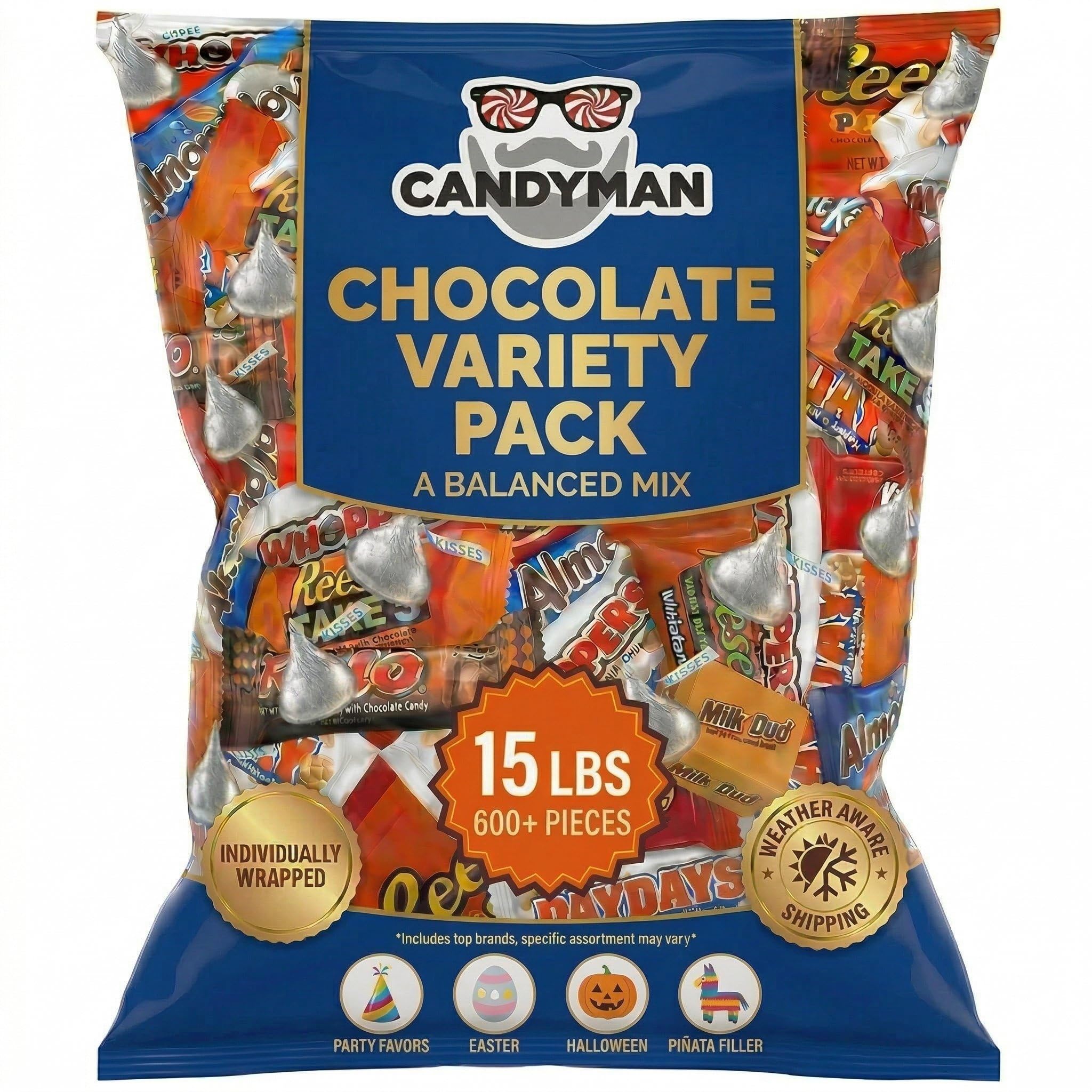 Varied Selection: CANDYMAN’s 15 pound bag of chocolate bulk candy individually wrapped includes a wide range of milk chocolate, dark chocolate, and other chocolatey flavors. Enjoy bulk chocolate candy individually wrapped for on the go snacking. Holiday & Valentine's Day Candy: Perfect for Valenti