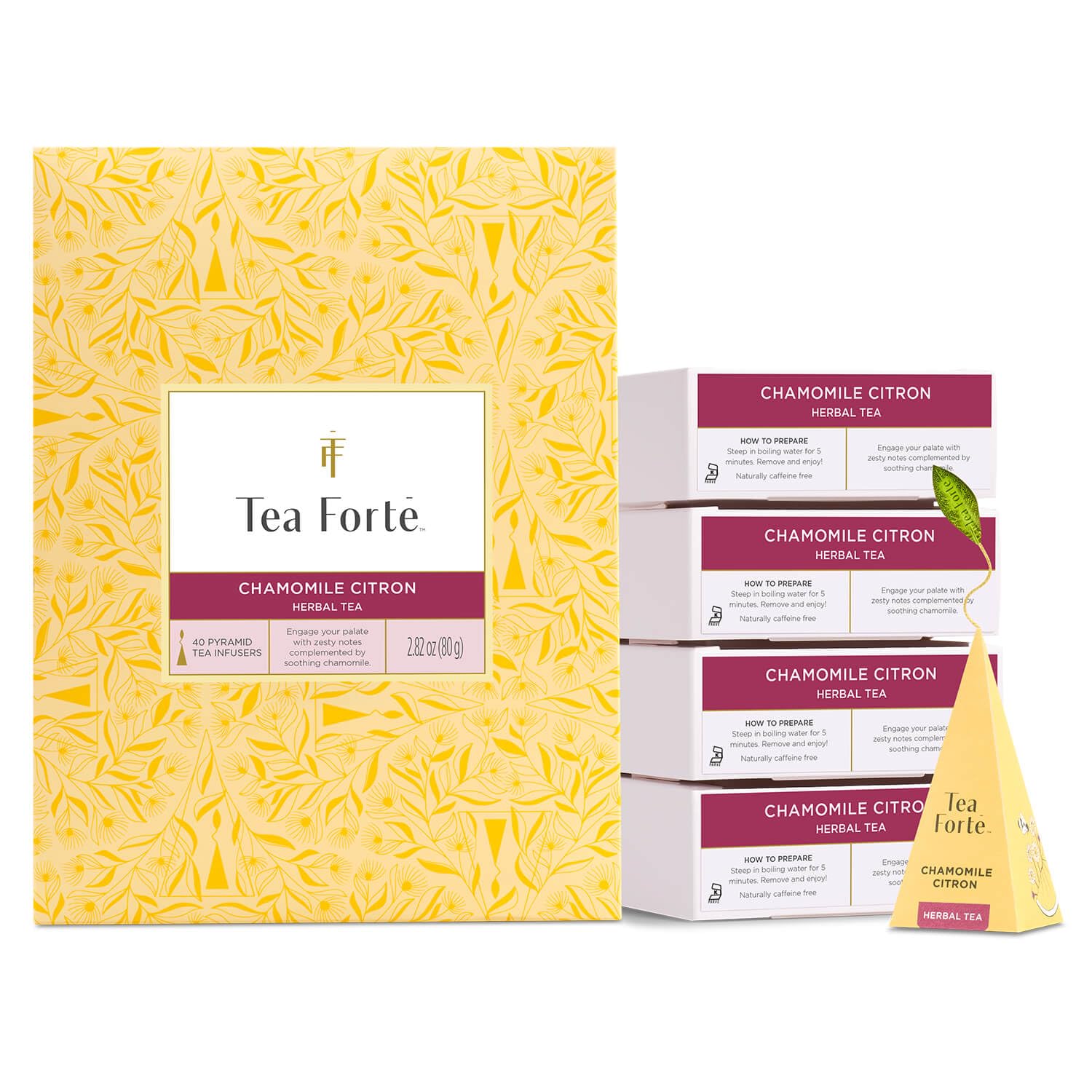 Tea Forte Chamomile Citron Premium Caffeine-Free Herbal Tea Blend Event Box, Bulk Pack 40 Count, 10 per tray Individually Wrapped Handcrafted Pyramid