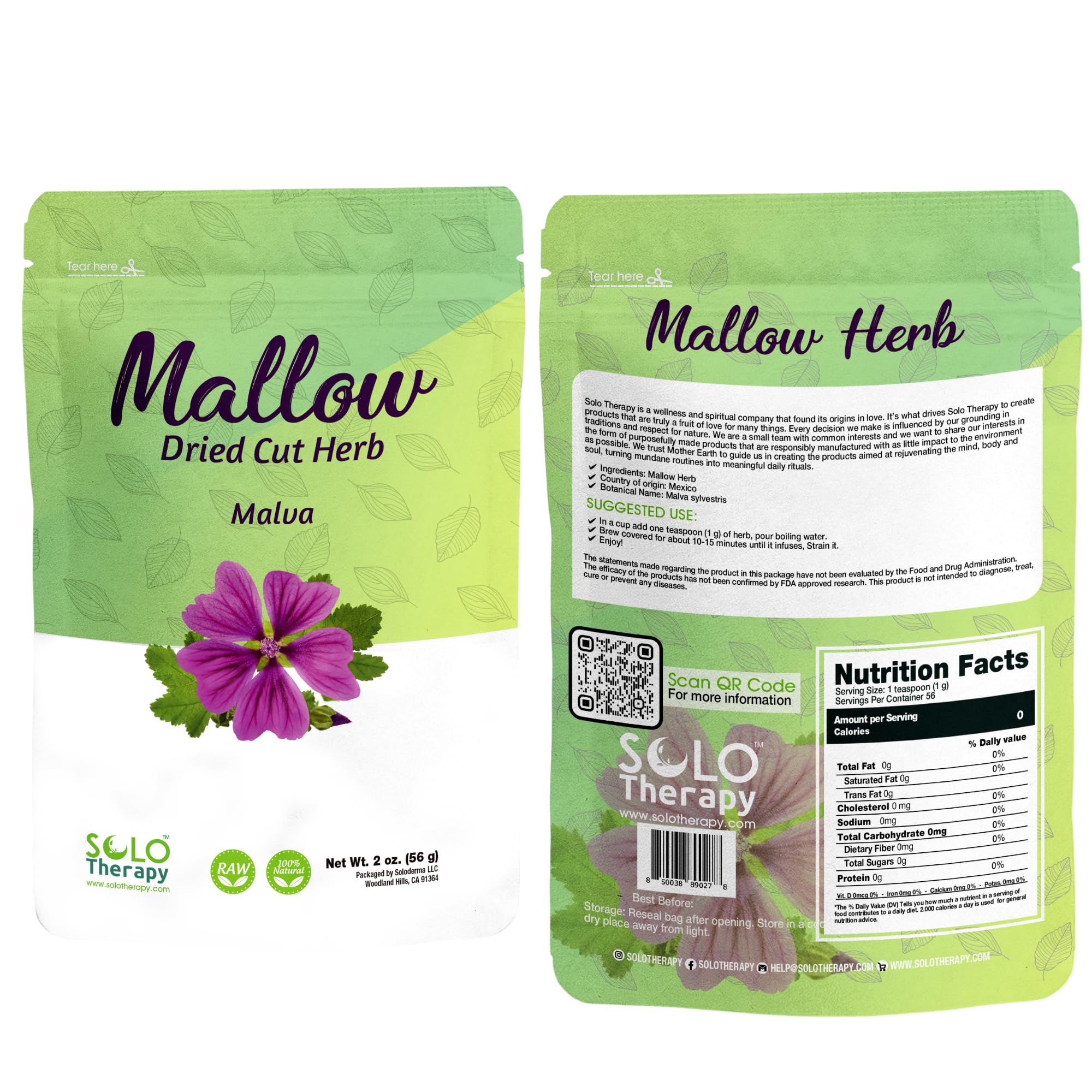 Mallow dried cut herb - 2 ounces. Malva - 2 onzas. Botanical Name: Malva sylvestris. Directions: Add 15 grams of Mallow herb to one liter of boiling water for three to five minutes. Reduce heat, strain and serve hot or cold. Honey and/or lemon juice make a delicious, healthy tea.